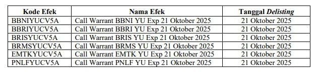 IDXC hannel -Bursa Efek Indonesia (BEI) mengumumkan penghapusan ataudelistingenamwaran terstrukturpada 21 Oktober 2025. Pengumuman jadwal delisting efek waran terstruktur di atas berdasarkan No. Peng-00189/BEI.POP/10-2025. Berdasarkan pengumuman Bursa, Jumat (10/10/2025), enam waran terstruktur ters