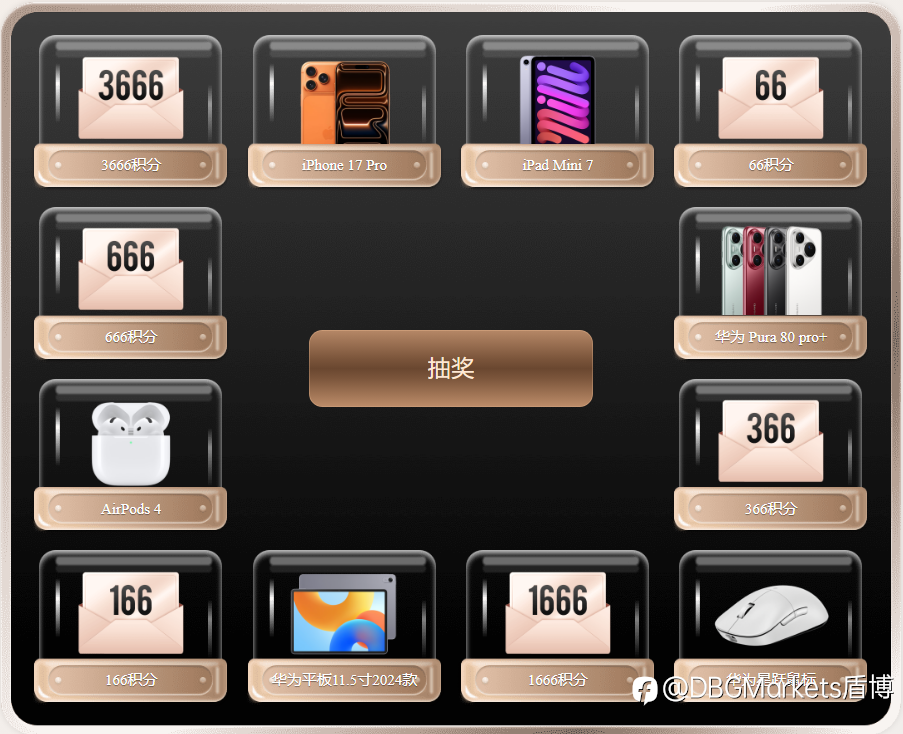 为了回馈广大客户的信任与支持,DBG Markets 特别推出十一月抽奖活动——“立冬开好运|iPhone 17 Pro等你拿”。 活动时间为 2025年11月1日至11月30日(GMT+2)。所有真实账户客户只需完成最低 6 手有效交易,即可获得抽奖资格,赢取 iPhone 17 Pro、华为 Pura 80 Pro+、iPad Mini 7、AirPods 4 等丰厚好礼。 活动亮点: • 人人可参与:活动面向所有 DBG Markets 客户开放,6 手交易即可获得抽奖资格; • 豪礼升级:包括 iPhone 17 Pro、华为 Pura80 Pro+、iPad Mini 7、华为平板、