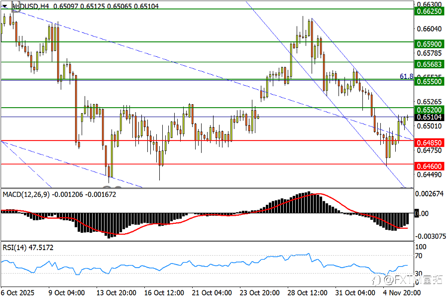 NO.1 澳元/美元(AUD/USD) –收复跌势上轨,起底信号有待做实 日线图看,澳洲联储周二(11月4日)维持利率不变,然而市场情绪似乎更侧重于对顽固通胀的担忧,所幸汇价隔夜随美元回落而反弹。眼下回升仍需面对10月中旬高位密集区0.6520的压制,收复后,行情就有借隔夜锤头线站住波段更高低点的机会。随后6月中旬高点0.6550(去年10月至今年4月跌势的61.8%回撤位),8月14日高点0.6568(8月双底颈线)也都是强阻参考。指标方面,MACD在零轴下方死叉;RSI重返弱势区,空头仍占据一定优势。 4小时图看,澳/美回到8-9月下行通道上轨上方,且有松动新近跌势的迹象。要维系现有起底迹