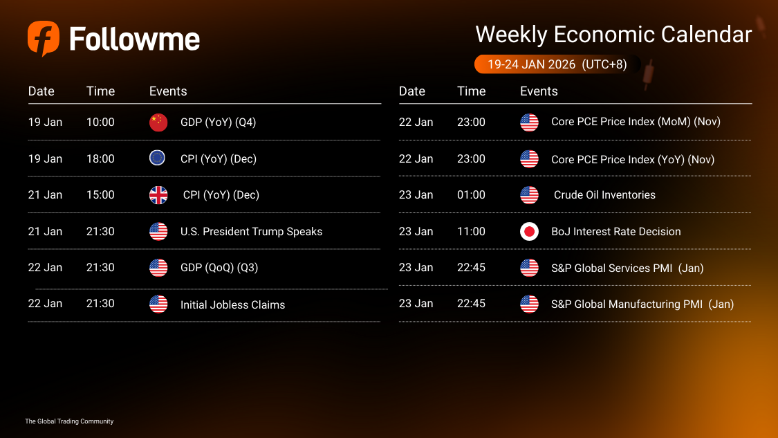 Weekly Economic Calendar: Week of January 19 - 24, 2026 (GMT+8) This week’s macro calendar is driven by U.S. inflation (Core PCE) + late-week growth checks (S&P Global PMIs), with BoJ rate decision as the key Asia risk event. Early week, China GDP and Euro CPI can move broader risk tone, w