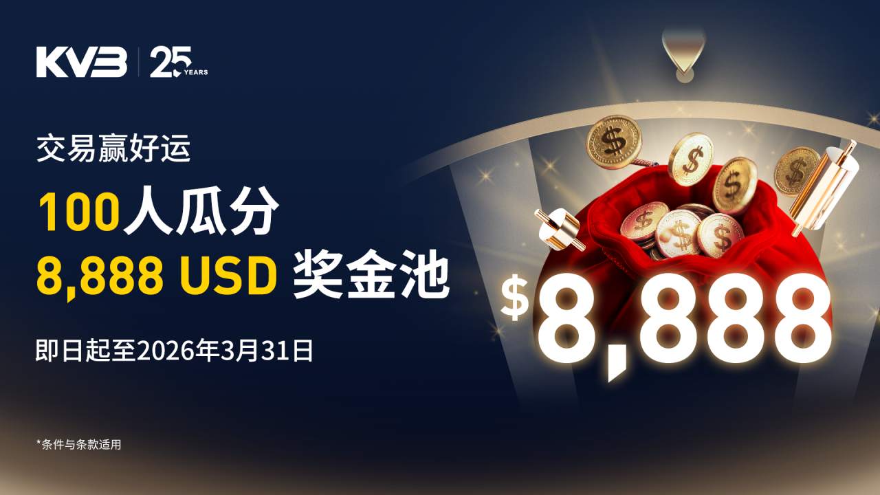 KVB 特别推出限时专属抽奖活动 —— 入金达标 + 完成交易即可参与瓜分 8,888 USD 奖金池! 🎯 随机抽取100位幸运儿 💰 最高可得 1,888 USD! 🗓 活动时间: 即日起至2026年3月31日 (北京时间) 🎯活动参与条件 只需完成以下步骤即可参与: ✅通过活动指定链接注册 ✅首次入金 ≥ 500 USD ✅活动期间完成 ≥ 3 标准手交易量 (仅计算已平仓订单,每笔订单持仓 ≥ 180 秒) 每满3手有效交易量的用户即可获得1次奖金池抽奖机会, 最多可累计 5 次! 💰 奖金池结构(100人瓜分 8,888 USD) 📌 奖金将直接发放至客户交易账户,可用于