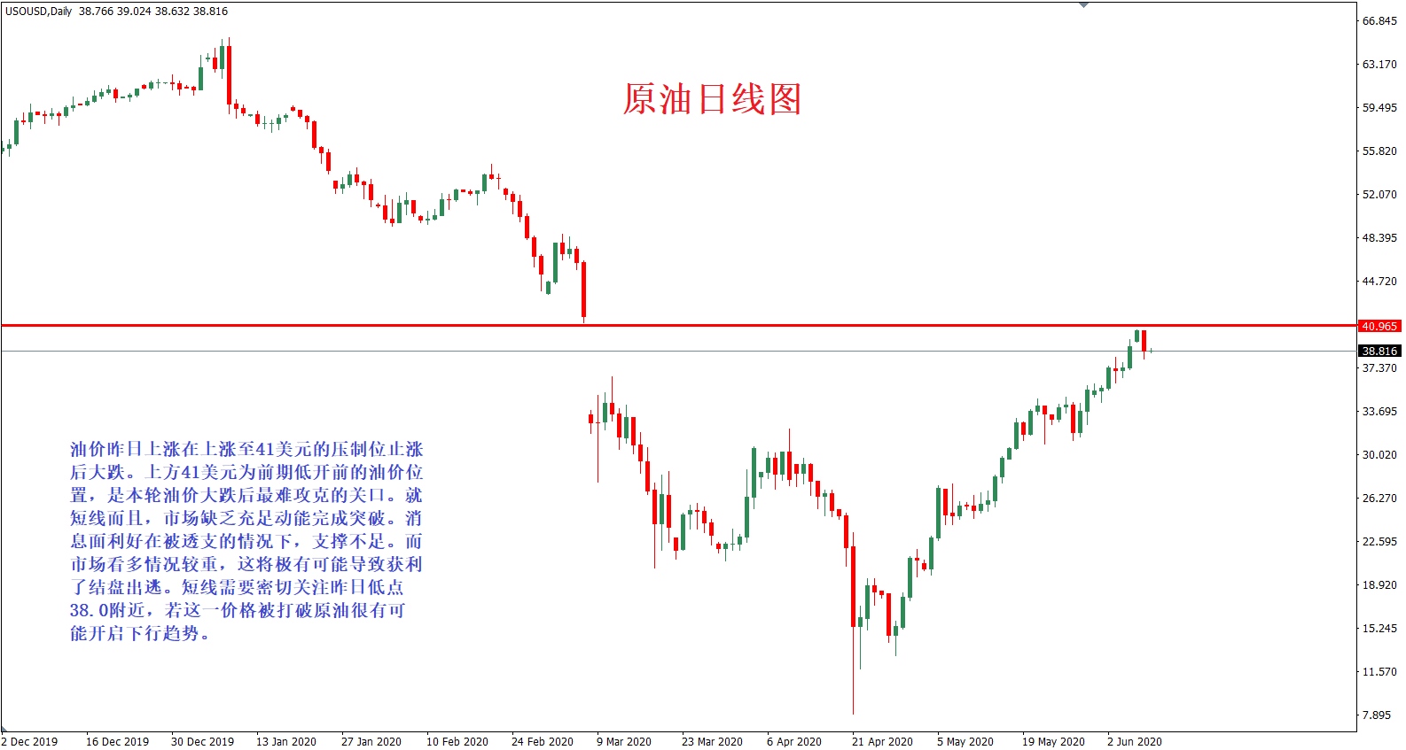 行情回顾6月8日美元指数下滑,美元兑日元跌逾1%,创3月27日以来最大跌幅,美国10年期国债收益率和油价下跌,帮助推低美元兑日元汇率;经济重开的乐观情绪推动商品货币纽元、澳元、加元继续大涨。现货黄金盘中一度升上1700美元关口,因投资者预计美联储保持鸽派立场。油价跌逾3%,沙特将停止额外减产冲淡了OPEC+延长减产的利好。 基本面回顾解读周一全球股市上涨,美元走低。短期内良好的非农数据没有能够持续的支撑美元,在市场趋于稳定,避险情绪回落的背景下美元继续承压。而金价在前期大跌后,低金价吸引买盘加之本周将迎来美联储利率决议市场交投较为谨慎没有延续大跌行情。虽然产油国周末达成延长减产的协议