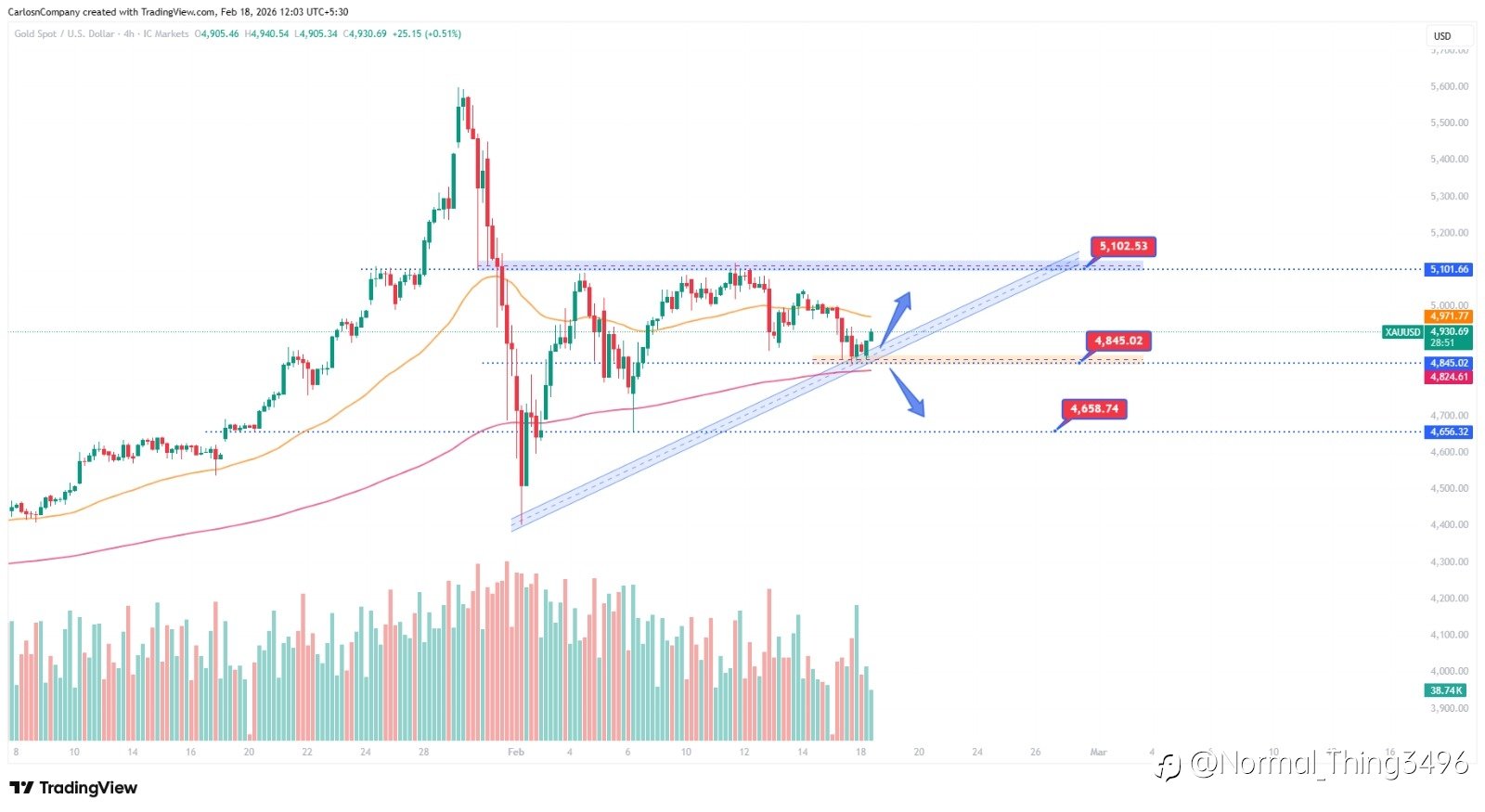 Gold is at a major technical inflection point. After breaking the rising channel and sweeping liquidity at 4,856, price is now reclaiming the 4,845–4,900 zone — a classic decision area. Trade Map: 🔼 Above 4,845 → bullish continuation Targets: 5,000 → 5,100 🔽 Below 4,845 → bearish continuation Targ