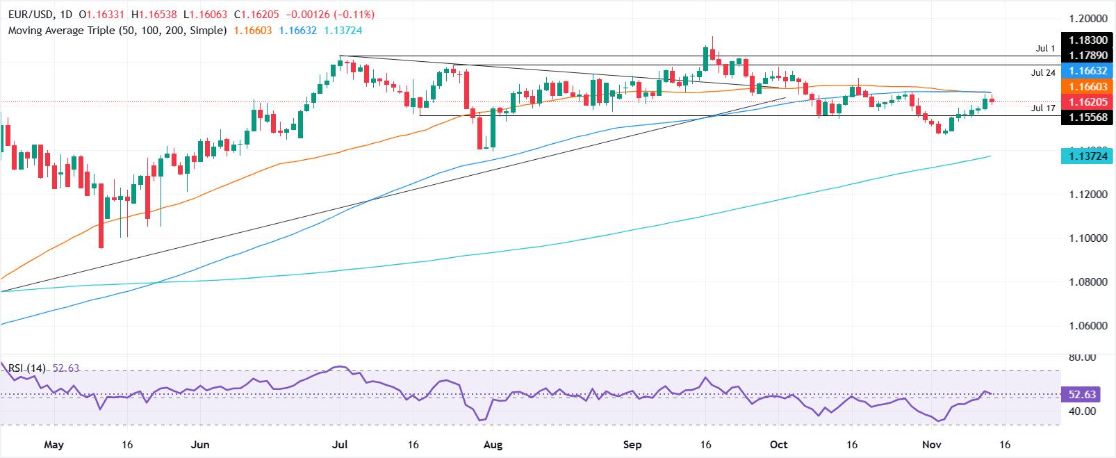 EUR/USD giảm 0,10% vào thứ Sáu nhưng kết thúc tuần tăng 0,51%, giữ vững trên mức hỗ trợ quan trọng.Các quan chức Fed có xu hướng diều hâu, giảm tỷ lệ cắt giảm vào tháng 12 xuống 56%, mặc dù một số người chỉ ra sự yếu kém của thị trường lao động.Tổng sản phẩm quốc nội (GDP) khu vực đồng euro tăng 0,2