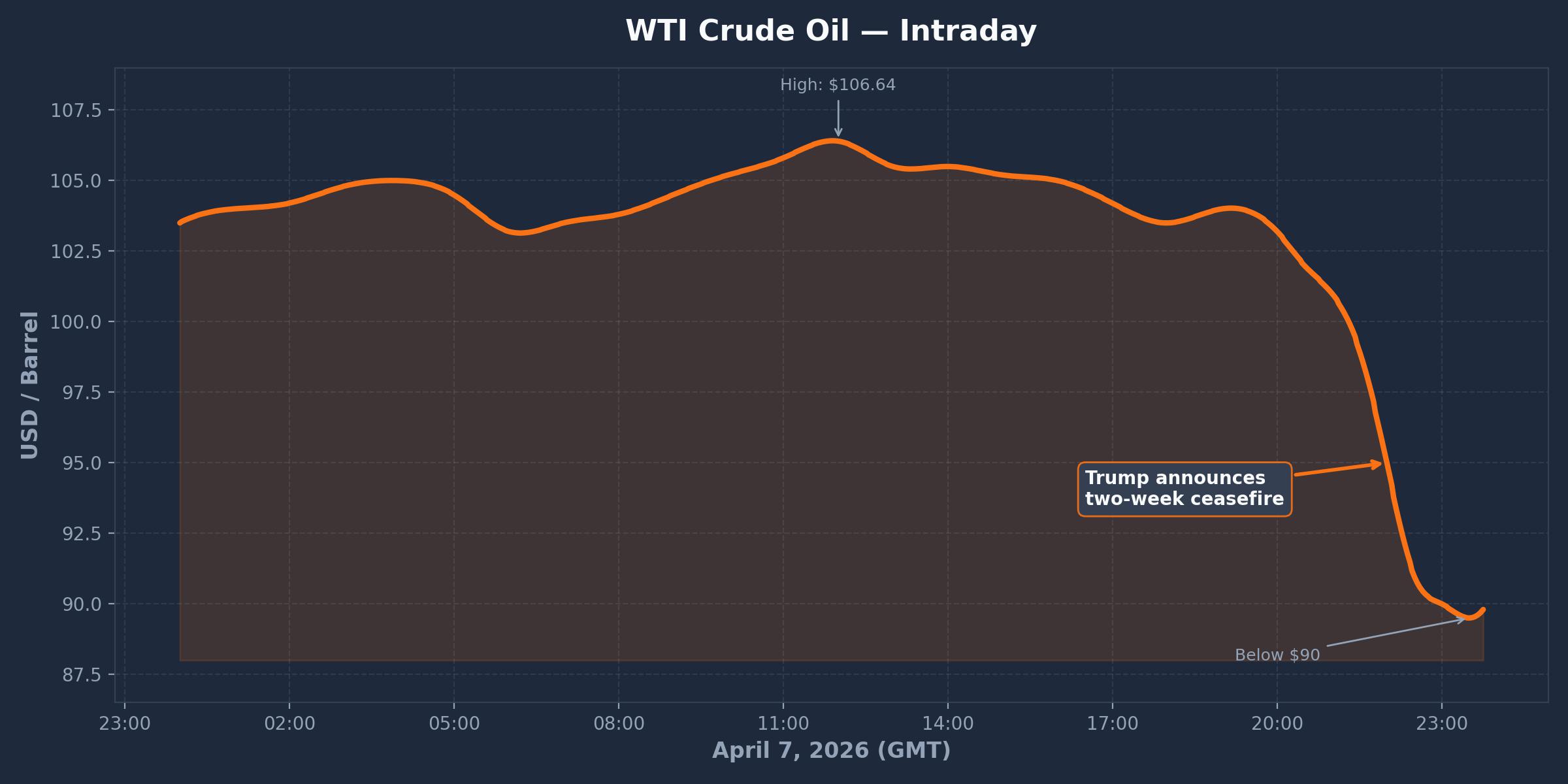 WTI Dầu thô giảm mạnh từ trên 106$ xuống dưới 90$/thùng vào thứ Ba sau khi Tổng thống Trump thông báo đình chỉ hoạt động quân sự chống lại Iran trong hai tuần, mặc dù thị trường đã bán Dầu trong suốt phiên khi các nhà giao dịch đặt cược ông sẽ nhượng bộ trước hạn chót 00:00 GMT thứ Tư. Hợp đồng tươn