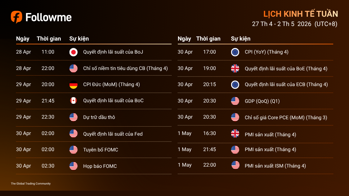 LỊCH KINH TẾ TUẦN (20/4/2026 - 25/4/2026)