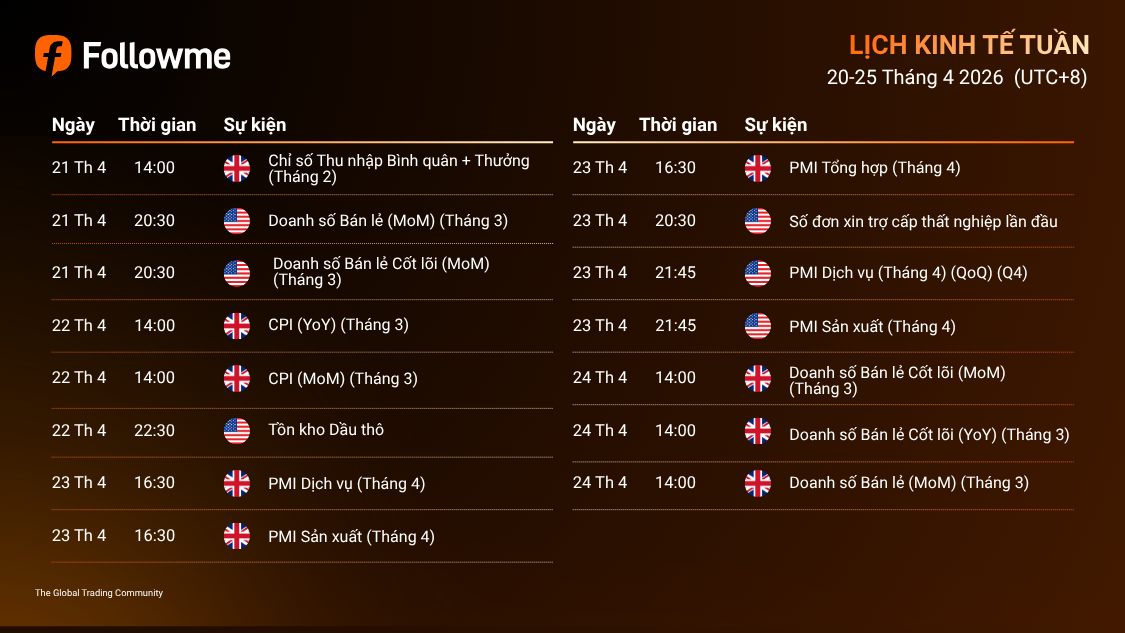 Lịch kinh tế tuần : Ngày 20/4/2026 - Ngày 25/4/2026 (GMT+8) Lịch kinh tế tuần này có cấu trúc tập trung hơn, với trọng tâm chính đến từ Vương quốc Anh và Hoa Kỳ. Tuần giao dịch mở đầu với dữ liệu tiền lương của Anh cùng cụm dữ liệu b&aacu