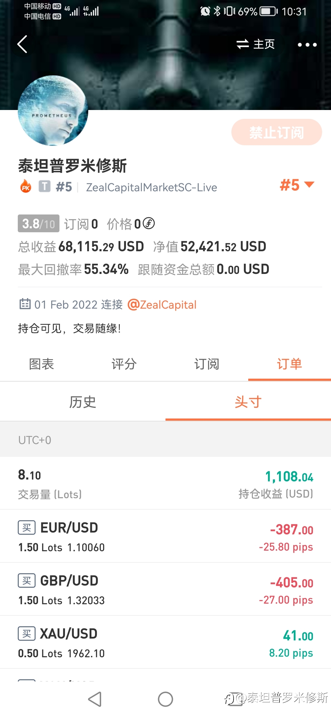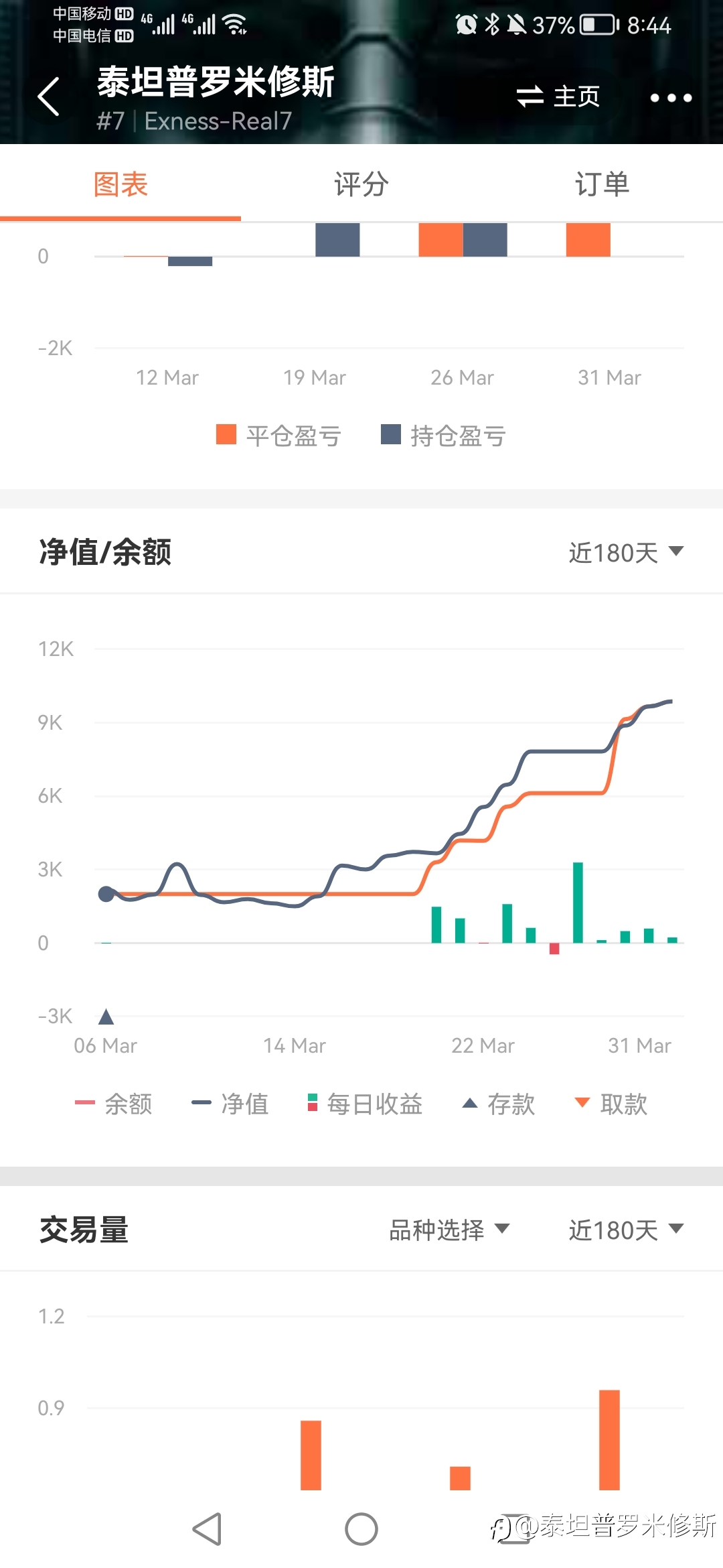 3月6日入金2000美金,截止三月底净值9870美金。累计交易5.45手,获利7870.45美金,希望4月能再创新高!