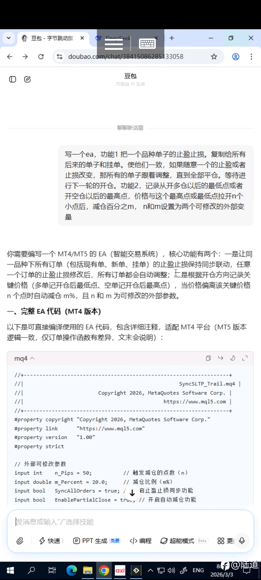 今天起了个大早。就是想看看周末事件带来的冲击有多强。 大家的交易有没有迎来开门红? 今年最火的,当属人工智能,就连长辈都开始用豆包对话。 功能更强悍的是人工智能体,未来也许会成为每个人离不开的东西。 很快,我们将迎来无APP时代。 不管是外卖、家政服务、机票车票等,只需要告诉智能体,其他的它全搞定。而不需要我们亲自去打开某个软件,然后搜索、对比。 虽然我还没有属于自己的智能体,但是通过对话,我做了以下几个尝试。 首当其冲的是,我需要这样的一个功能: 电脑打开,当MT4里某个品种价格高于多少或者低于多少,手机能接到报警。 这个功能其实并不复杂,但是在以前,我需要自己搜索网页,找到真正有效的信息,