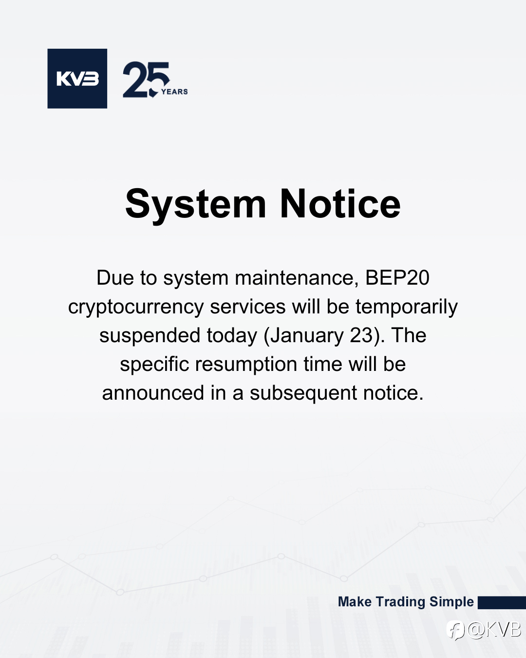Due to system maintenance, BEP20 cryptocurrency services will be temporarily suspended today (January 23). The specific resumption time will be announced in a subsequent notice.