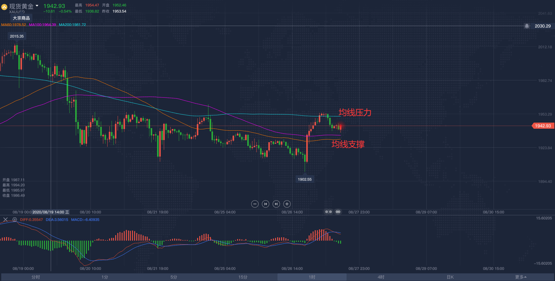 日内1955依然看空!2020/8/27各位投资朋友们大家好,我是阿满。市场虐我千百遍,我依然待她如初恋。市场的投资者包括投资机构对于今天就开始的央行年会上的鲍威尔讲话都看好他的鸽派言论,也致使在昨晚多头进场拉升50美元,最终还是在熟悉的位置受到压力1955。在当前的位置看空还是我的观点,上次虚破1955给到1962本来就没多大的参考性,所以大家不必担心,1955这个压力位置是能起到作用的,大胆去看空,1950附近也能够去进场,那么底部的首个支撑位置,可以看MA:60日均线支撑1930或者MA:100日支撑1933。目前的亚盘阶段不会出现什么大行情,主要看今天明天的欧盘美盘阶段,市场的波动会非