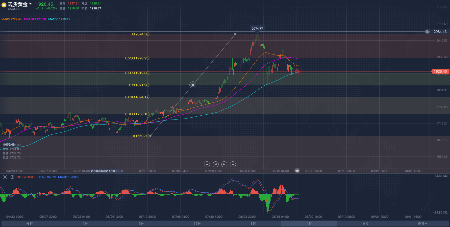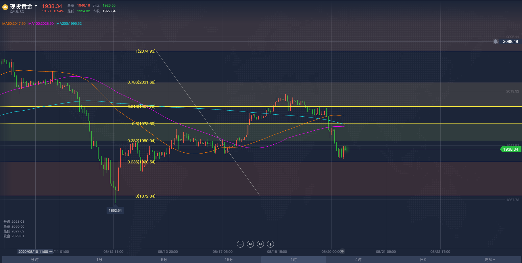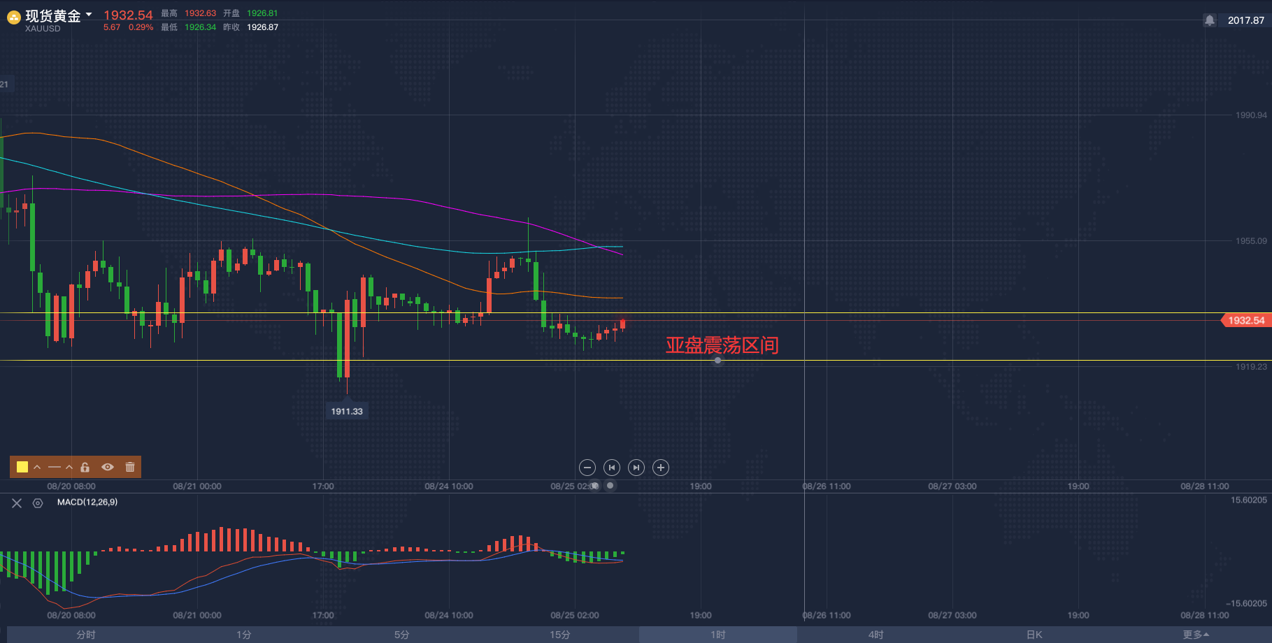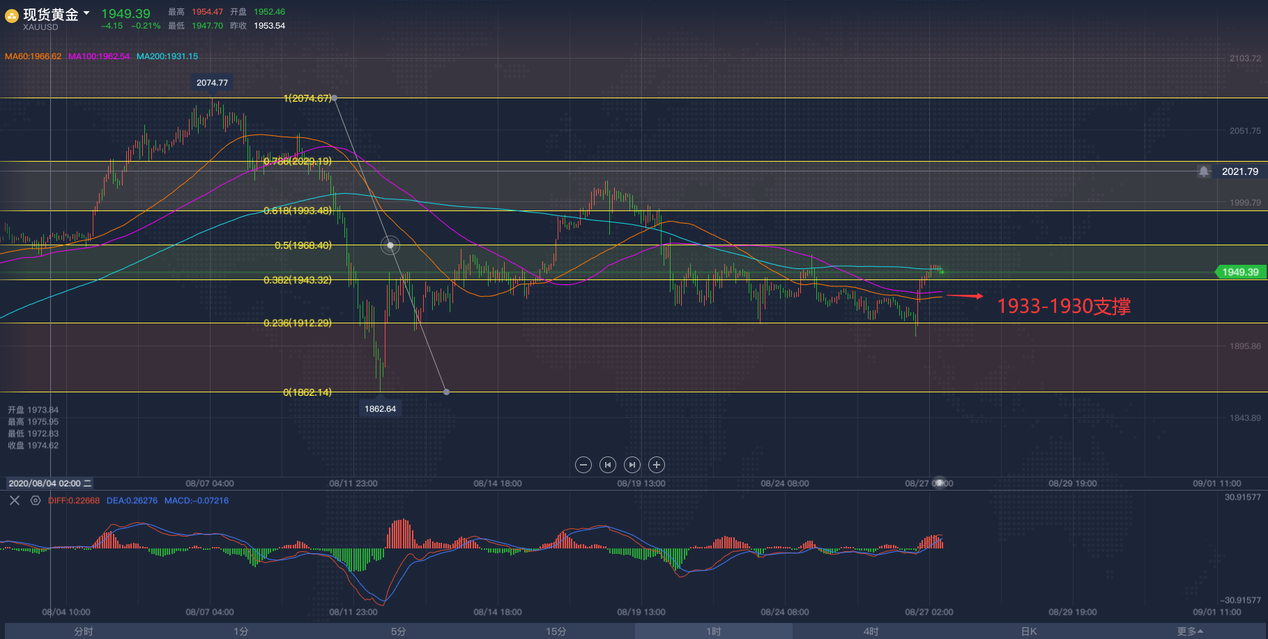黄金亚市短线操作建议,飓风终于让原油冲破区间!2020/8/26各位投资朋友们大家好,我是阿满。昨天晚间跟大家分享了一下对于黄金看空的想法,头肩顶形态还在继续,大幅抛售是确定的。目前黄金市场受到1913附近的支撑阻力,这个点位是下行趋势斐波那契的0.236回调位,在我看来,黄金要跌的话,这些支撑都不会太顽强,像昨天晚上下破1921(历史前高位置)根本没有多呆一秒钟。为啥还要给到大家这个点位呢,主要是现在的亚盘阶段行情不会有太大波动,大家想做交易依然利用低多高空的思路去做,那么底部需要关注的点位则是1913附近,上方看到MA移动平均线60日均线与100日均线给到的压力位分别是1933-1937,