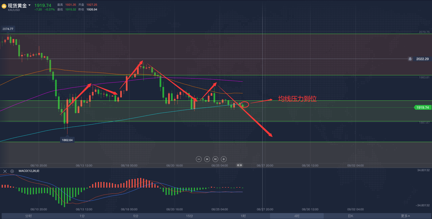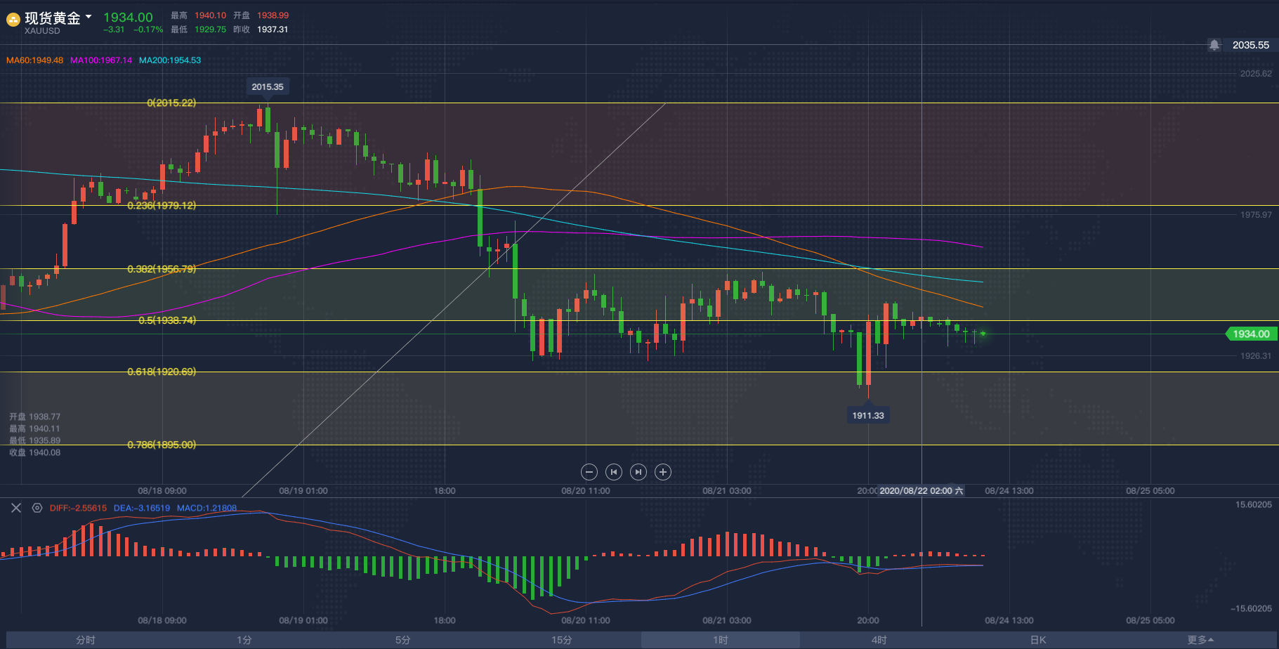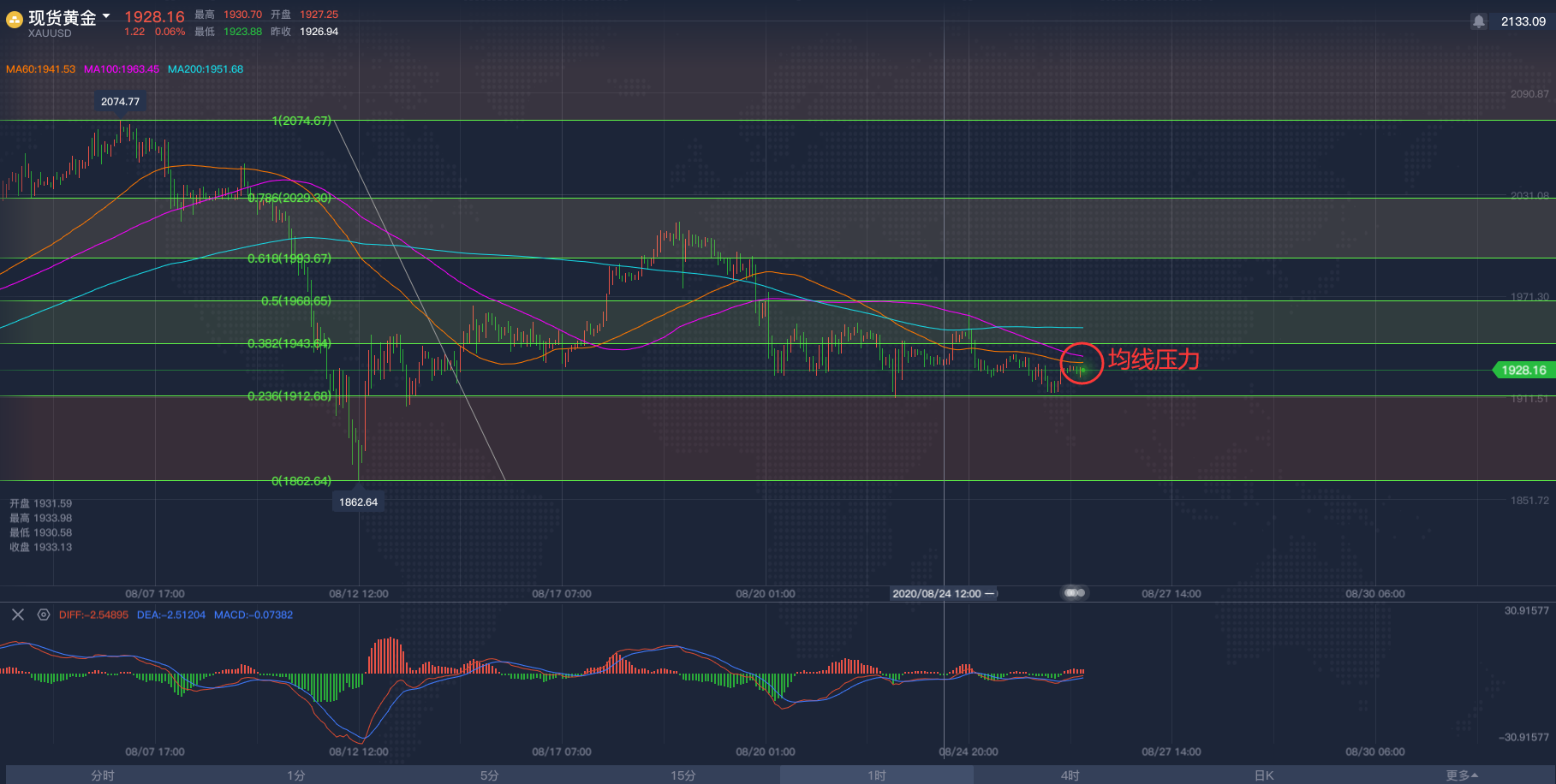 黄金亚市短线操作建议,飓风终于让原油冲破区间!2020/8/26各位投资朋友们大家好,我是阿满。昨天晚间跟大家分享了一下对于黄金看空的想法,头肩顶形态还在继续,大幅抛售是确定的。目前黄金市场受到1913附近的支撑阻力,这个点位是下行趋势斐波那契的0.236回调位,在我看来,黄金要跌的话,这些支撑都不会太顽强,像昨天晚上下破1921(历史前高位置)根本没有多呆一秒钟。为啥还要给到大家这个点位呢,主要是现在的亚盘阶段行情不会有太大波动,大家想做交易依然利用低多高空的思路去做,那么底部需要关注的点位则是1913附近,上方看到MA移动平均线60日均线与100日均线给到的压力位分别是1933-1937,