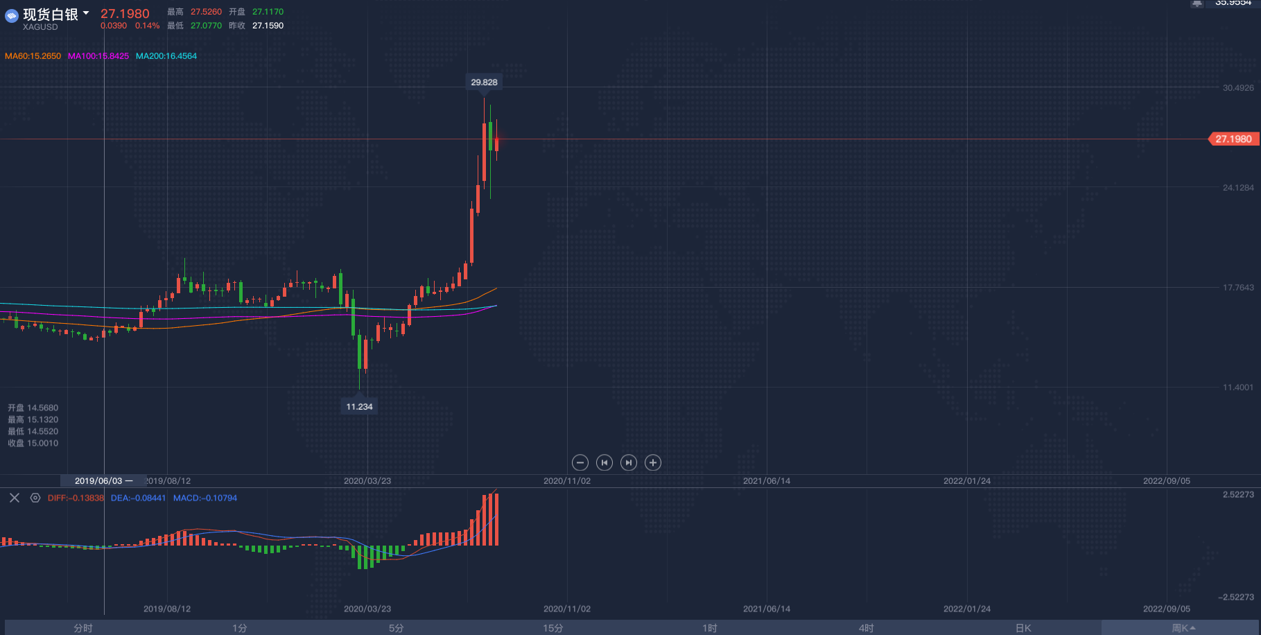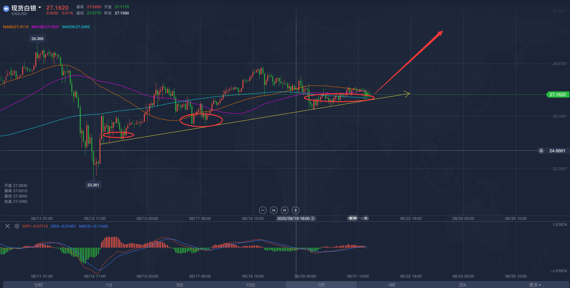 白银在酝酿大招2020/8/21大家好,我是阿满。最近黄金写的太多了,感觉已经没有什么好分享的了,市场的投资者们有兴趣请退出查看我其他关于黄金的文章。下午的时间跟大家再去看看现货白银,这个平常不太受人关注的大宗商品(目光基本都被黄金市场带走了),其实也是对于它比较大的波动劝退的,确实在白银市场你非常容易赚到钱也非常容易赔个底儿掉。其实早在月初也跟大家分享了白银的作用,其实相比黄金,白银的用途是更加广泛的,科技、工业、医疗、制品等等,它的需求量非常高,也同样有着极高的保值效果,并且也作为对抗通胀的商品。在我今天看盘面发现,白银市场似乎在酝酿一波大行情,单单从盘面来看,白银黄金的走势其实相差无几,