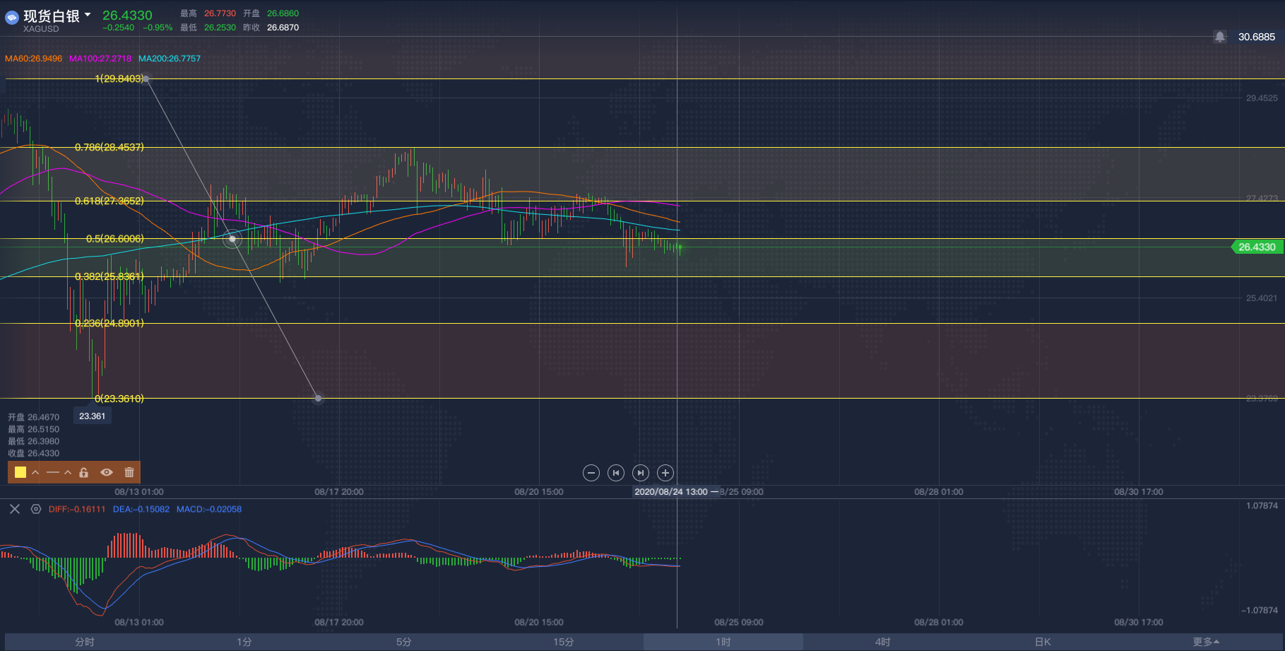阿满财经:欧盘黄金白银原油交易思路2020/8/27 各位投资朋友们大家好,我是阿满。欧盘将近,下午交易的一些思路和点位跟大家分享一下。现货黄金,一小时图,可以见图中的MA200的均线(蓝线)压力在1950,下方MA60日均线(橙线)支撑1930附近,这两个均线给到的支撑压力是相对有效的,在4小时图中均线也显示在这两个点位上有支撑与压力,大家在欧盘阶段可以注意这两个点位,整体已做空为主做多为辅,止损都带个6点就OK了。目前大方向或者说是大行情具体是空还是多,我今天不能很好的跟大家去分析,因为在晚间9:10鲍威尔会发表讲话,对于通胀方面会不会发表言论会变得十分重要,市场到时候可能会迎来比较大的波