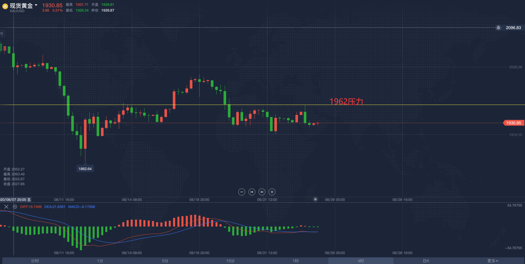 央行年会在即,金市迎来剧震!2020/8/26各位投资朋友们大家好,我是阿满。伴随着美盘开盘我的文章也开始写作了,写作期间现货黄金已然按照我这两天的思路持续看空,没有任何问题,当下突破1911的前低位置下探1908.66,从黄金4小时图中可以看出,头肩顶形态赫然形成,后续一定会有一波回调,持续看空的我只想一直抓空,并且我还需要抓住大跌的大行情,在下午直播的时候我跟许多投资朋友们说了,这波头肩顶形态到1890才算得上刚刚开始,后续持续看空知道我的目标位置1862-1820!并且我个人认为,此次的央行年会上美联储主席鲍威尔对于“货币政策框架评估”的讲话,需要重点关注的是他对于通胀目标的调整,这次的