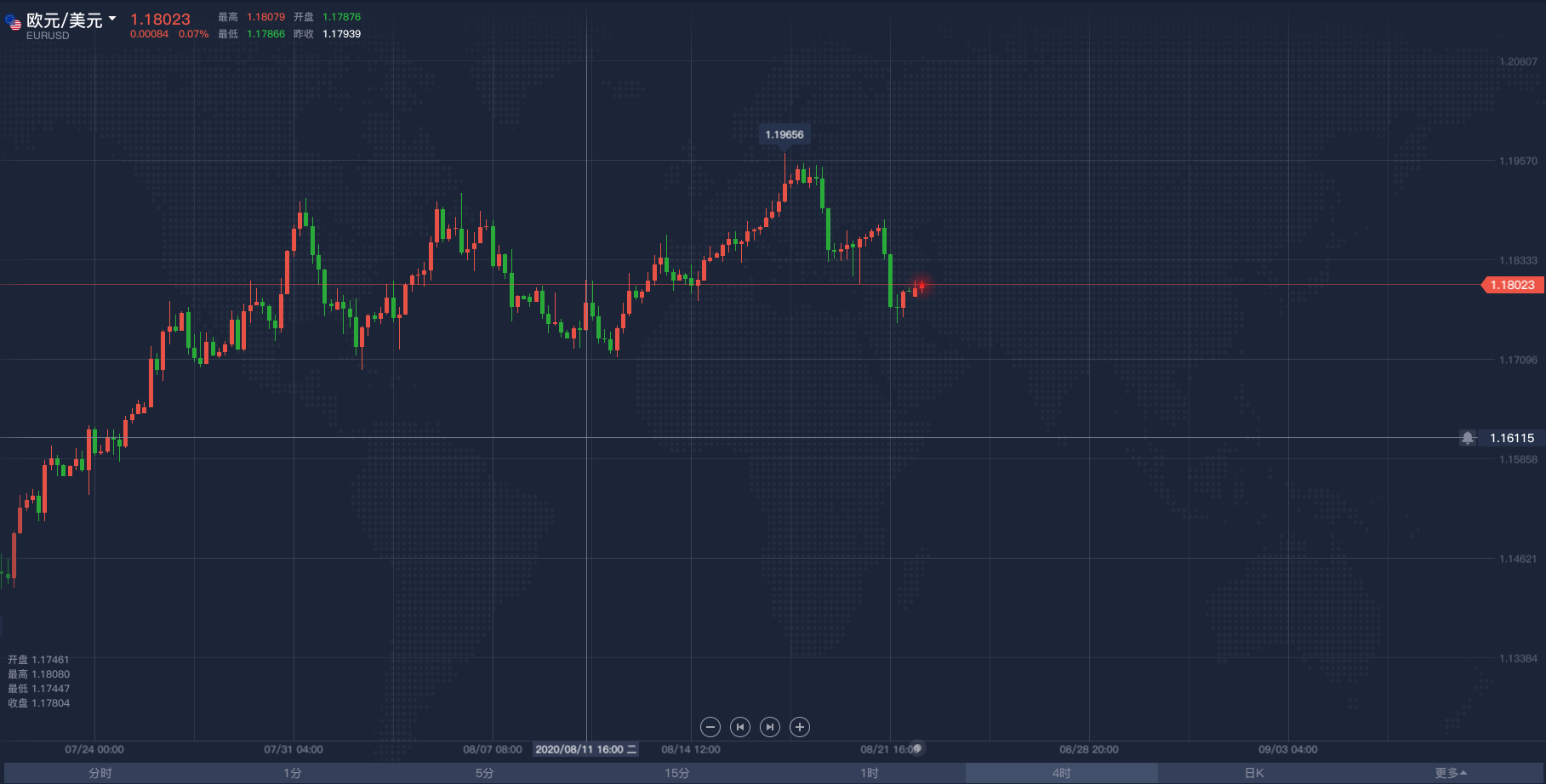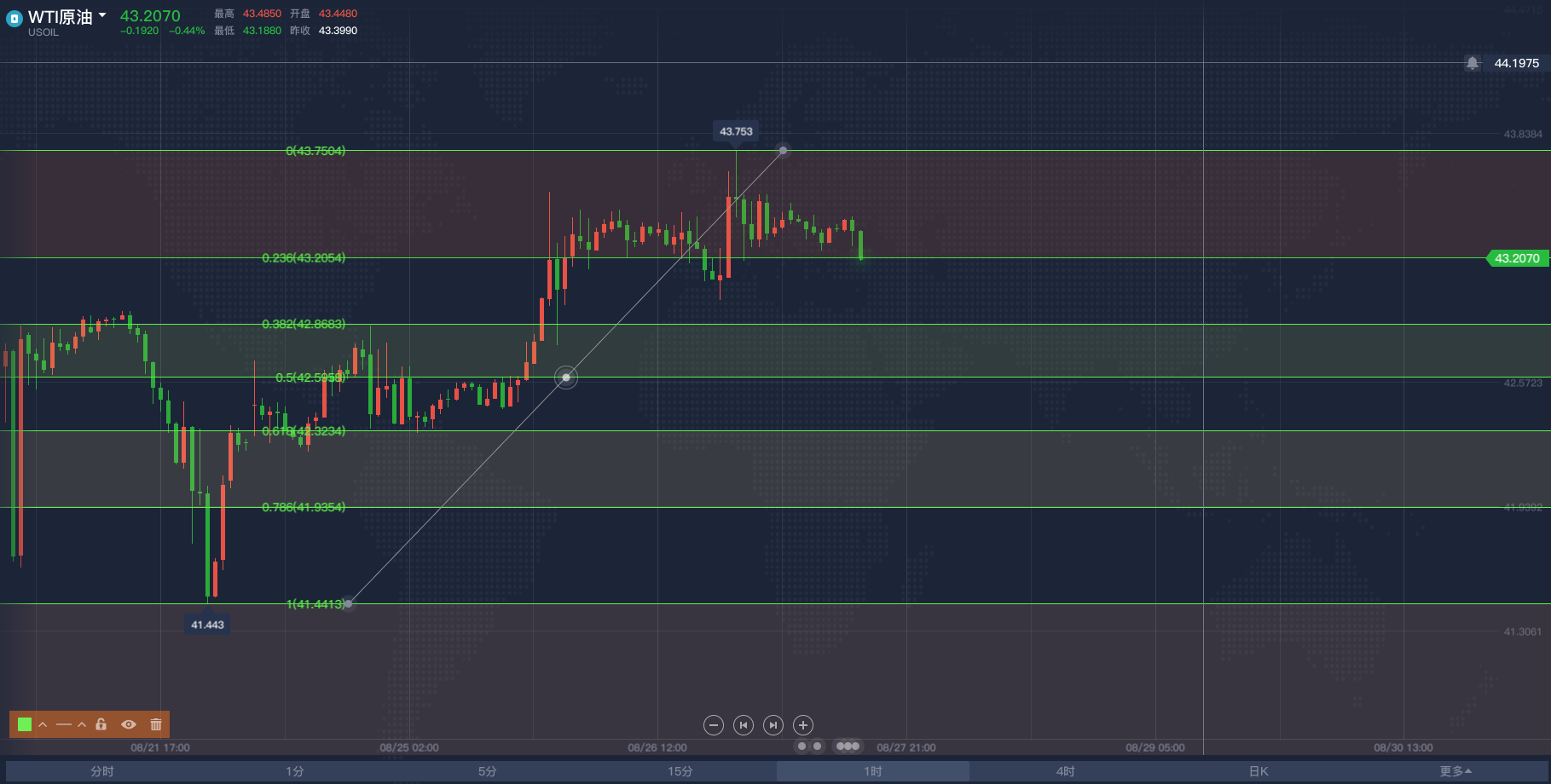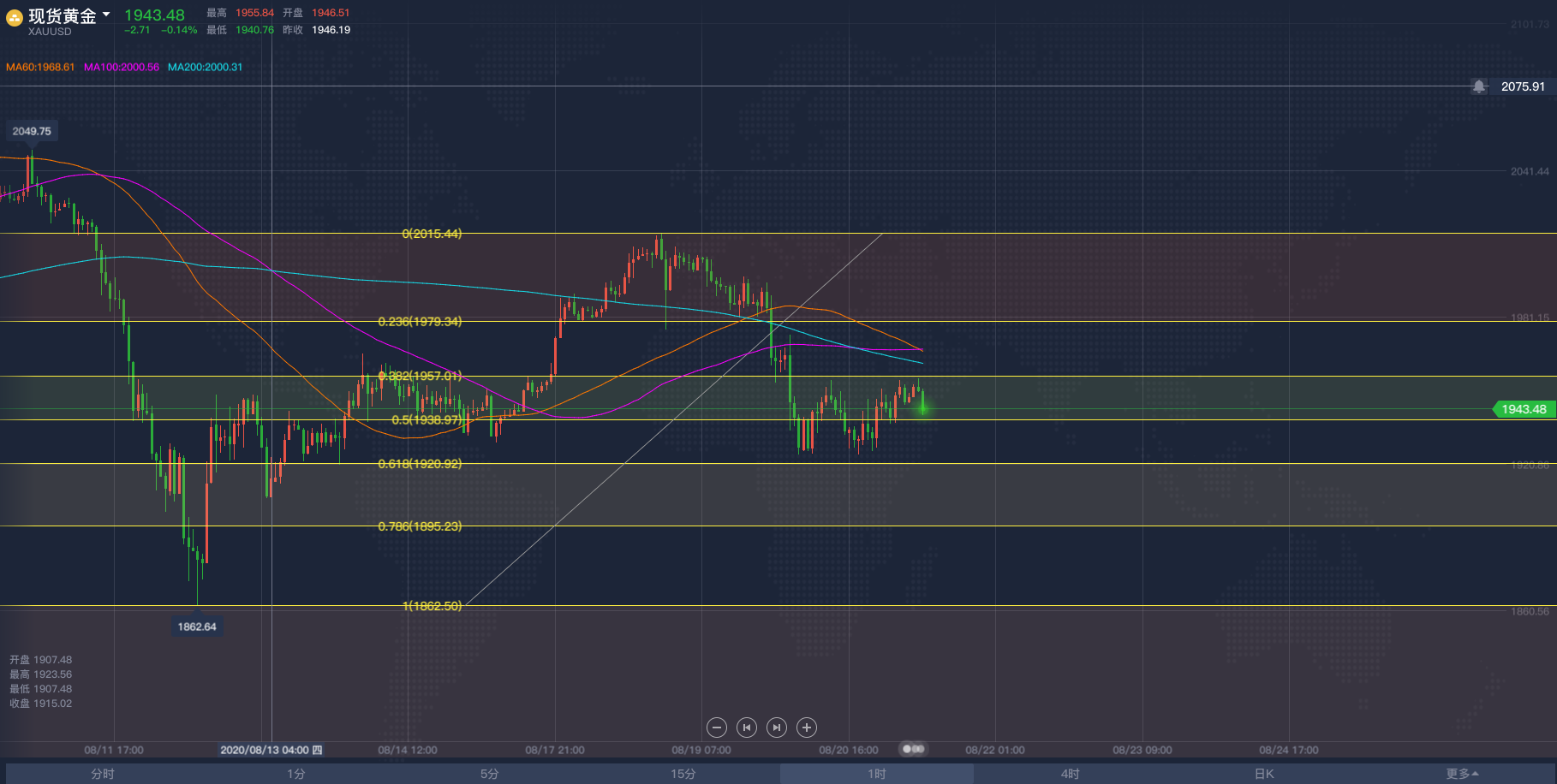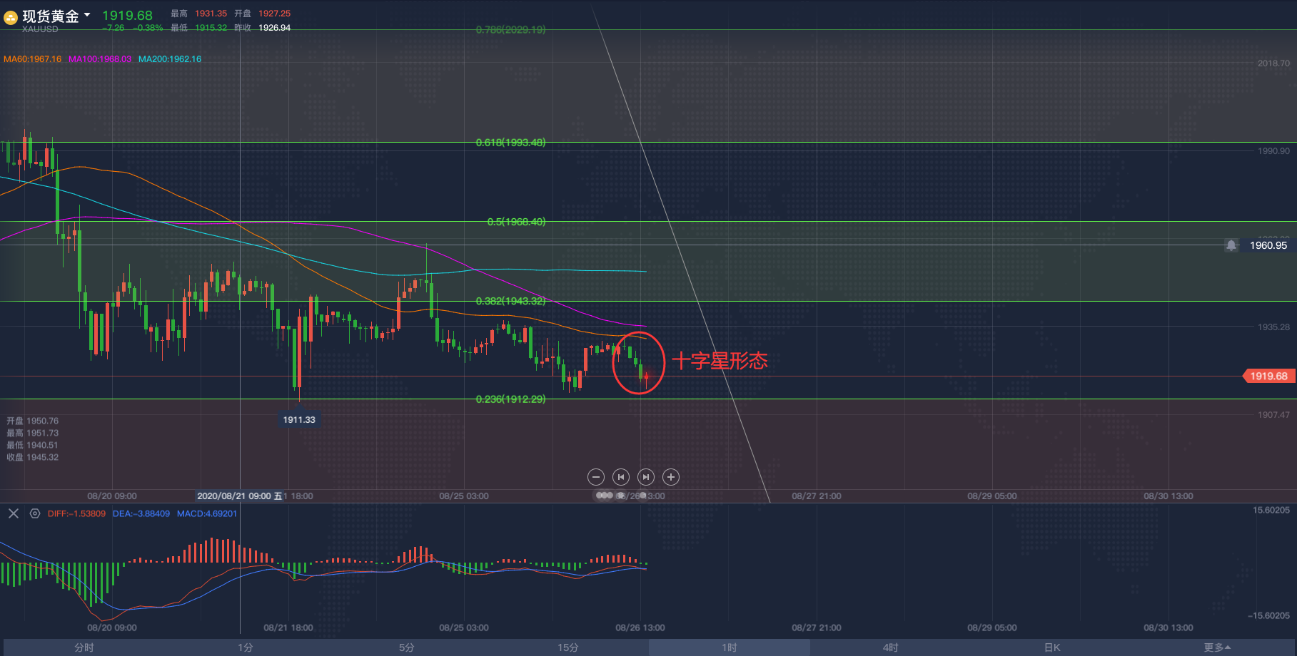 欧盘阶段黄金操作思路2020/8/26各位投资朋友们大家好,我是阿满。欧盘将近,现货的黄金的操作思路跟大家分享一下。由于今天在黄金方面没有什么重要的基本面数据公布,所以全是按照技术层面去给到大家的点位。黄金一小时方面,利用斐波那契回调位给到现价的底部支撑在1912附近,单从K线蜡烛图来看,目前1914已经给到过5次支撑,那么欧盘阶段则需要关注这个点位会不会被有效下破,成功下破则继续看空。K线形态方面,上午10点的蜡烛收线收出了一个十字星形态上引线长,并且一路走低,意味着当下的空头势力强劲1914或许会成为这波十字星的有效支撑,如果没能突破,则可以在此点位进行短线看多,最多可以看到1930下方,