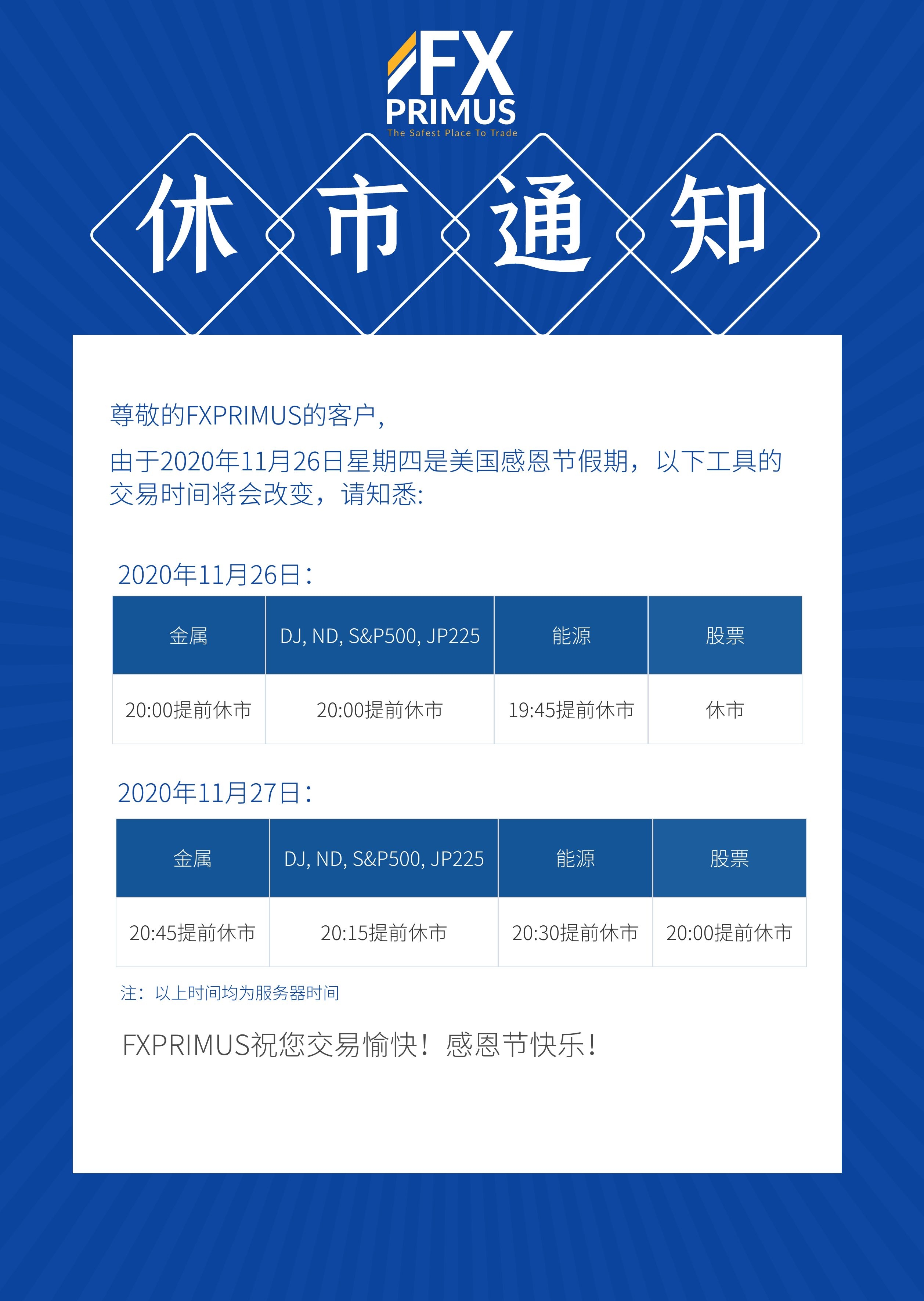 【FXPRIMUS百利汇】敬请您留意2020年美国感恩节黄金、原油、指数产品交易时间的变更