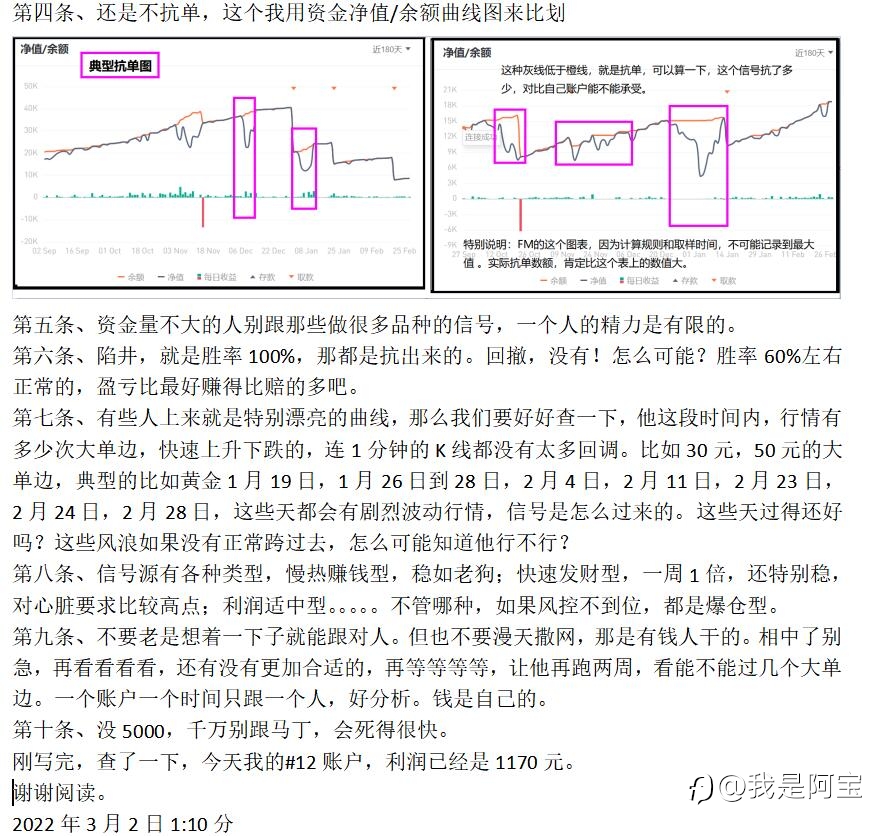 个人的一点体会,不喜勿喷,本人不接收。因为这是我个人的体会,会帮到一些人。 本人跟过无数人的单,现在只跟一个信号@小曾--财富。为什么?其它跟过的大多赔钱了,爆仓了,最好的理由是赚钱有些慢。但并不是说没有其它好信号。找信号嘛,也有个先来后到。后面又淘到了几个好信号,奈何我已经爆仓若干个,没那么多钱了,只能跟一个而已。 先亮一下我的#12账户 确实开心,自己不会做,跟单就是爆仓,这个信号总算稳定了一个半月了,而且收益不错。我觉得有必要分享一下我对信号的筛选基本要求。不要问为什么,我和所有信号源非亲非故,也都是从FM信号中海淘出来的。一定要问我为什么要分享这些,我说:同是天涯沦落人,一年爆仓无数轮