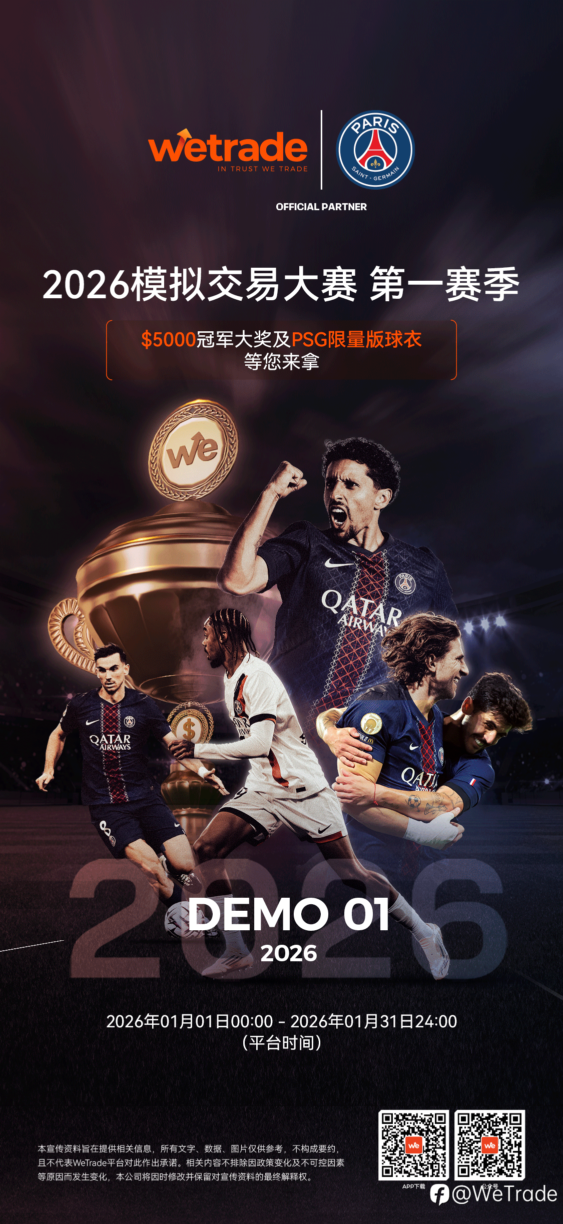 在世界级足球赛场上,胜利从不属于偶然。精准的战术布置、稳定的心态控制、对比赛节奏的深刻理解,决定着最终能否举起冠军奖杯。在金融市场这片没有终场哨声的绿茵场上,交易,同样是一场高强度的竞技对决。行情如同瞬息万变的攻防转换,每一次进出场,都是对判断力与执行力的考验。 作为巴黎圣日耳曼的官方合作伙伴,WeTrade承袭足球竞技体育的精神内核,正式开启WeTrade 2026 模拟交易大赛。第一赛季重燃战火,全球交易精英再次集结,向真正的“交易冠军”发起冲锋。 回顾 2025:六场属于全球交易精英的“冠军联赛” 2025 年,WeTrade成功举办