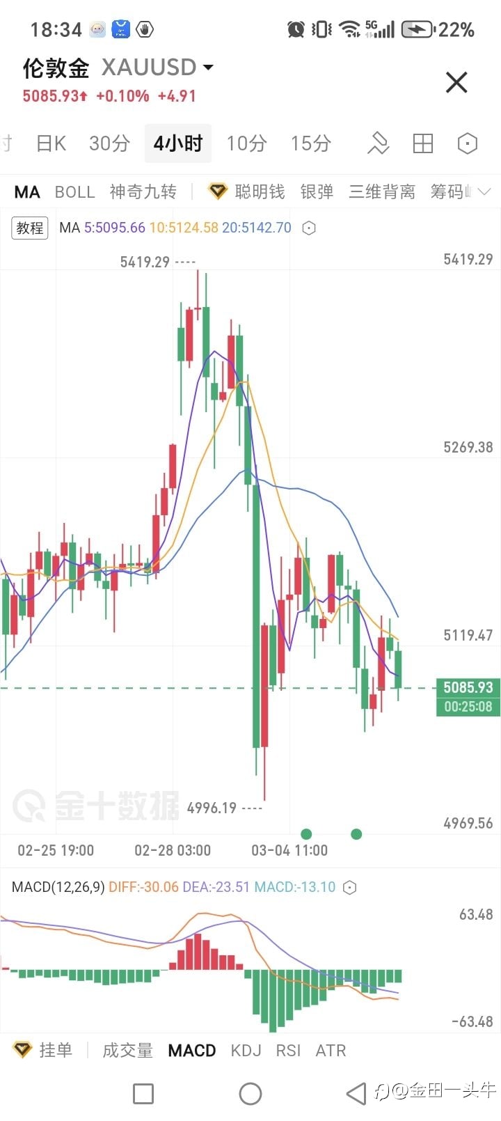 5%挑战赛马上收官。 冠军几乎已经毫无悬念。 半年的时间,三分之二的选手淘汰,盈利选手不及25%。 上周的黄金走势可谓让很多人抓耳挠腮了。 因为冲突,周一开盘,黄金如愿跳高。 按照常规剧本,这么大的冲突,黄金的上涨将势不可挡。 然而仅仅维持了大半天,黄金便开启了回调。 短短两天从5400到5000。 幅度惊人。 家里有人问我,黄金现在的价格挺高,手里有点金子想卖,后续黄金会怎么走? 我只能说不知道。也许后续黄金价格的波动会变得更大。 本周开盘,2个小时,黄金从5190跌跌不休来到了5000附近。 乱世藏黄金,怎么就不灵了呢? 最近看到一个文章,讲的是观测。 我们生存的世界,不怕我们去观测,就怕