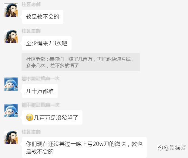 转眼到了11月。 今年,郭队的昵称又多了一个——麻总。 赚麻的麻。 惊叹之余,常常思考他说的那句话:信仰无价。 下半年我交易频率急剧变低,恰好最近又碰到几个别人的提问: 1,为何大部分个人交易员都是小赚大输? 2,交易中,严格执行了止损,却不断亏钱,交易的突破在哪里? 3,短线好还是长线好? 这里面第一个问题,我认为是交易哲学的范畴。 后面两个问题,是交易方式的具体体现。答案琳琅满目。 昨天在币圈,有个网友问大佬,你是通过什么学习或者经验,赚到今天这么多钱的? 大佬说,亏钱亏出来的。 其实,这个答案,可以完全覆盖上面3个问题。 沙漠里的人能够忍受45度的高温; 西伯利亚的人能够忍受零下40度的