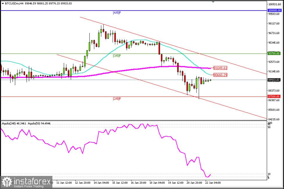 Bitcoin diperdagangkan sekitar $89.933, mengalami rebound setelah mencapai 2/8 Murray ($87.500) dan bagian bawah saluran tren turun yang terbentuk sejak 12 Januari. Bitcoin kesulitan untuk terus naik karena menghadapi resistance kuat dari 200 EMA sekitar $91.649 dan bagian atas saluran tren turun ya