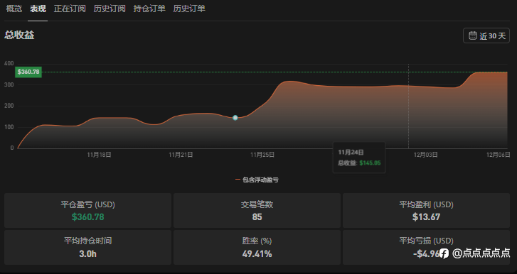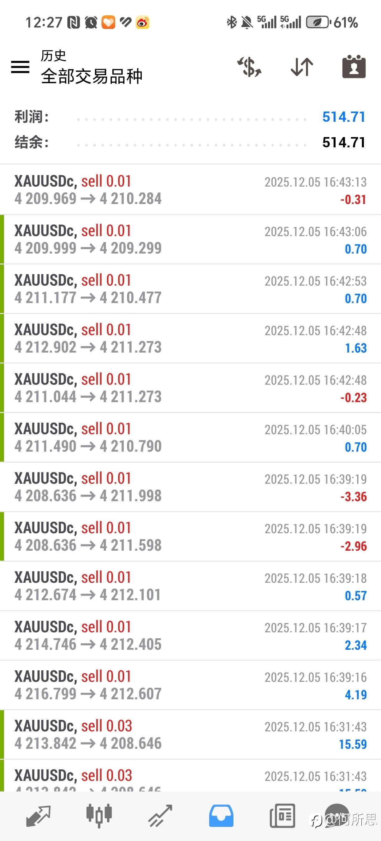 做交易久了,总会遇到形形色色的人,也总会面临无数次人性的拷问。最近我手头的两个美分马丁策略账号跑出来的数据,非常生动地诠释了什么叫“盈亏同源”。我想借着这两组数据,聊聊关于风险、关于“圣杯”幻想,以及我为什么在尝试了无数策略后,最终回归了马丁。 一、 0.4美金的生死线:收益与风险的直观博弈 我现在除了跑美金账号,还跑了两个美分账号作为对照组,策略逻辑一样,但参数设置一激进一保守: 激进号: 本金1000,硬止损1000。上个月收益1500。保守号: 本金1000,硬止损1000。上个月收益300左右。 上个月,保守号的最大浮亏只有200美金,甚至都没什么波澜。而那个激进号,最大浮亏达到了99