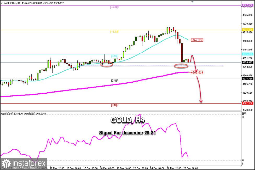 Sinyal Trading untuk EMAS pada 29-31 Desember 2025: jual di bawah $4,375 (pantulan - 8/8 Murray)