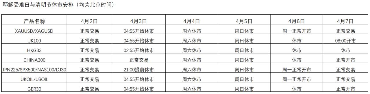 尊敬的用户: 由于2026年4月2日~4月6日是耶稣受难日与中国清明节假期,根据上游流动性提供商要求,部分产品将提前休市,具体安排见下表。请提前做好资金管理与风险控制。 如果您有任何问题,欢迎联系我们,我们将竭诚为您提供帮助。 电邮:supporteztradex.com e锤科技 2026年3月31日