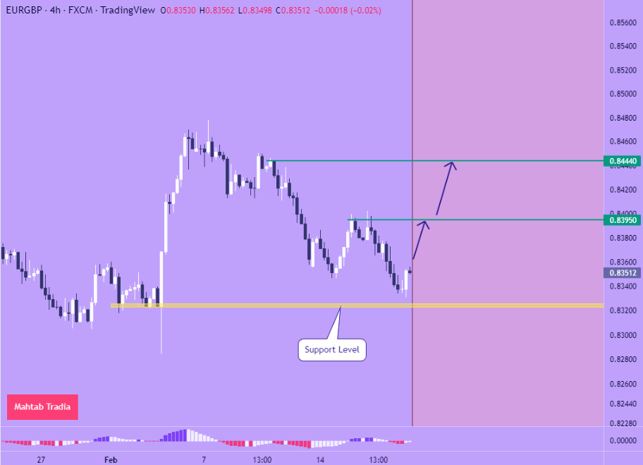 As you see in the 4H chart, price is in a downtrend and has approached to the yellow support level . If we take a look at the price structure, we can see that there was a sharp uptrend first, then price has started a downtrend. Currently, price failed to break the last major low at 0.8323, and is pu