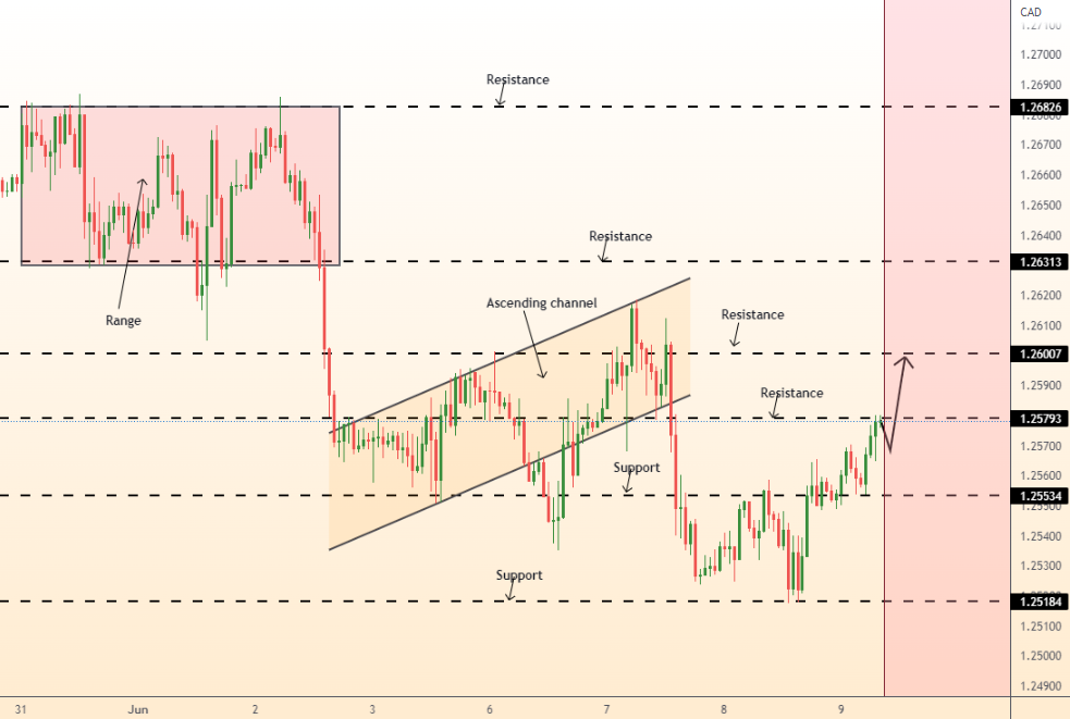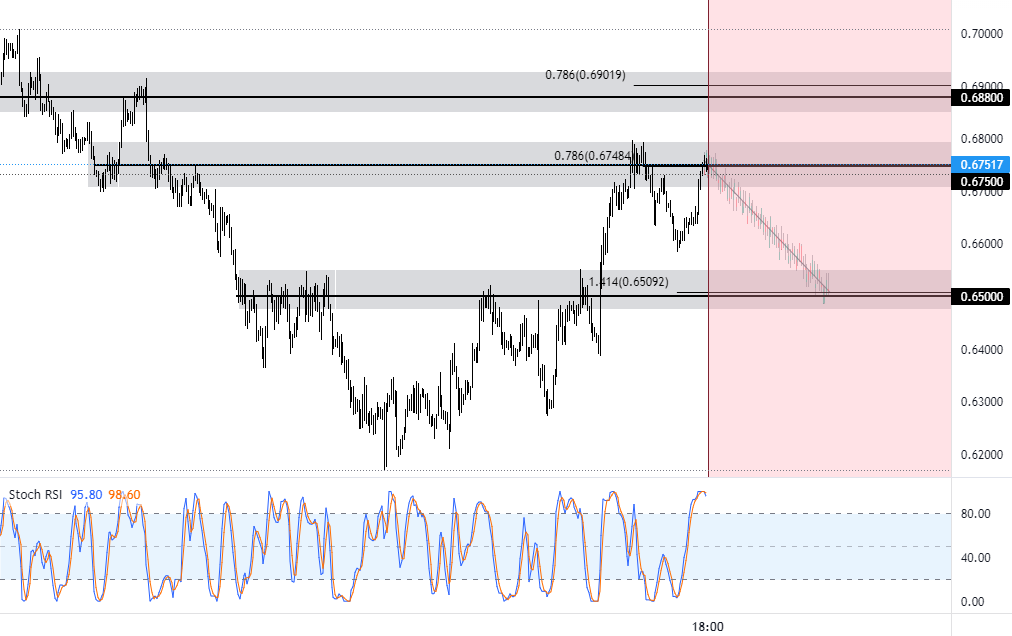 On the H4 timeframe, prices are facing bearish pressure from its resistance area at 0.67500, in line with the 78.6% Fibonacci retracement . The pullback to this zone presented an opportunity to play further drop to the next support target at 0.65000, in line with the 141.4% Fibonacci retracement . S