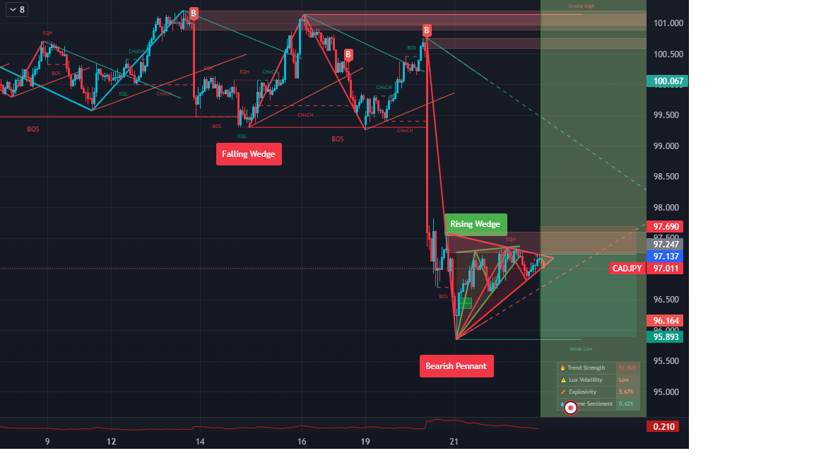 Price is approaching towards an order block where resistance is lurking, creating a potential opportunity for a sell. Impulse Short entries can be taken once price rejects that region. Rising Wedge and Bearish Pennant formations has occurred, which signifies a potential bearish breakout soon. We had