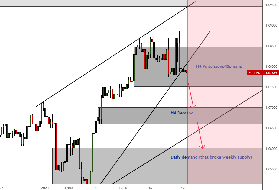 Although price is still creating Higher Highs which is indicative of the overall trend being bullish , it looks like we might be getting some nice pullbacks provided this current H4 Watchzone/Demand is broken. I hope you will be patient enough to wait for the break and pullback before shorting.
