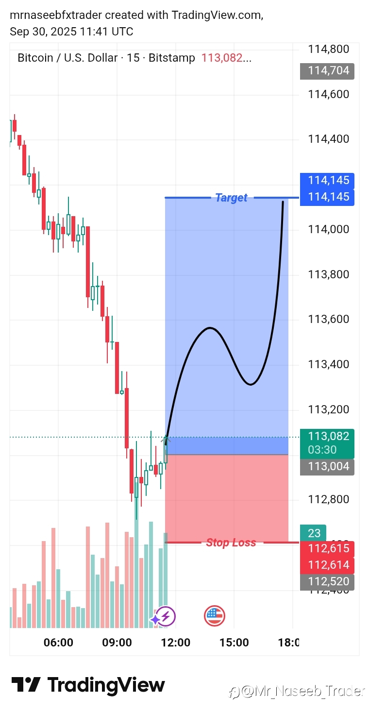 BTC/USD Trade Alert: Target 114,800 🕒 Timeframe: M15 🔻 Entry Price: 113,082 📍 Confirmation: Support Rejection + Upside Target 🎯 Take Profits: TP1: 113,300 TP2: 113,600 TP3: 113,900 TP4: ...