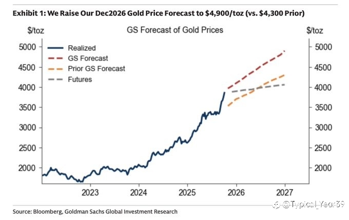 #Goldman# Sachs also raised its target for gold price for 2026 to a whopping 4900/oz, very close to 5000. It says continuous ETFs and Central Bank buying looks durable & sustainable. Basically, inst...
