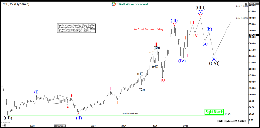 Royal Caribbean Cruises Ltd (NYSE: RCL) is a global cruise industry leader. This article analyzes its weekly Elliott Wave structure. Our examination uncovers the current bullish path and key targets ahead of the next correction. Elliott Wave Analysis From its 2020 low, RCL created a three-wave
