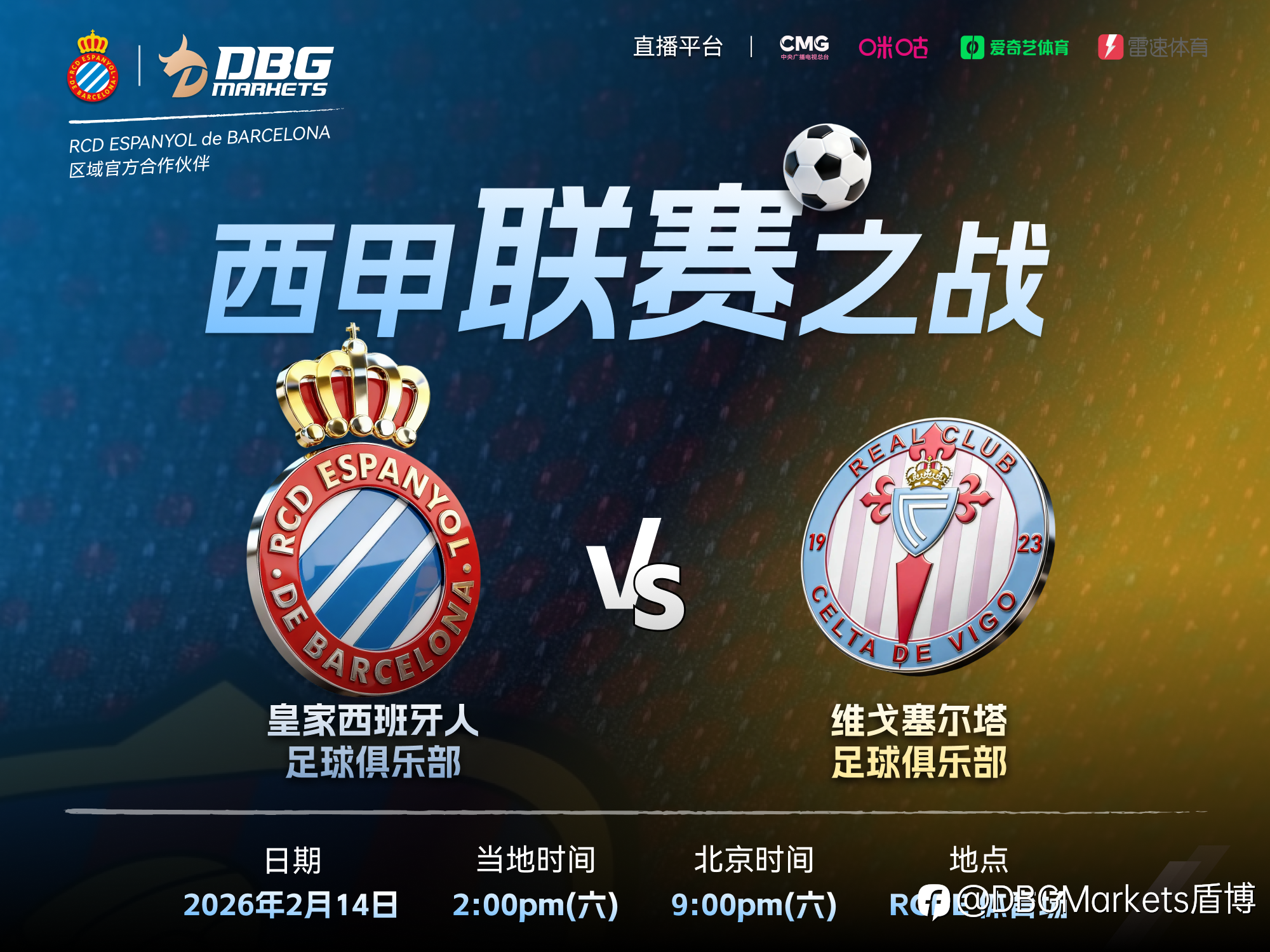 全球领先的多元资产交易平台 DBG Markets 将继续携手皇家西班牙人足球俱乐部(RCD Espanyol),迎来西甲赛场的第四个主场之战。2月14日,球队将在主场迎战维戈塞尔塔(Celta de Vigo)。 在此前的比赛中,球队不断积累经验、调整战术,并在前15分钟便成功取得进球,充分展现了战速调整的成效。这一亮点不仅证明了球队的进步,也为未来的比赛注入了更多信心与动力。第四个主场不仅是一场积分的较量,更是球队展现斗志与信念的重要舞台。对于皇家西班牙人而言,这是全力拼搏、争取突破的关键节点;对于 DBG Markets 而言,这是继续与球队并肩同行、共同见证每一次成长与挑战的旅程。 ⚽