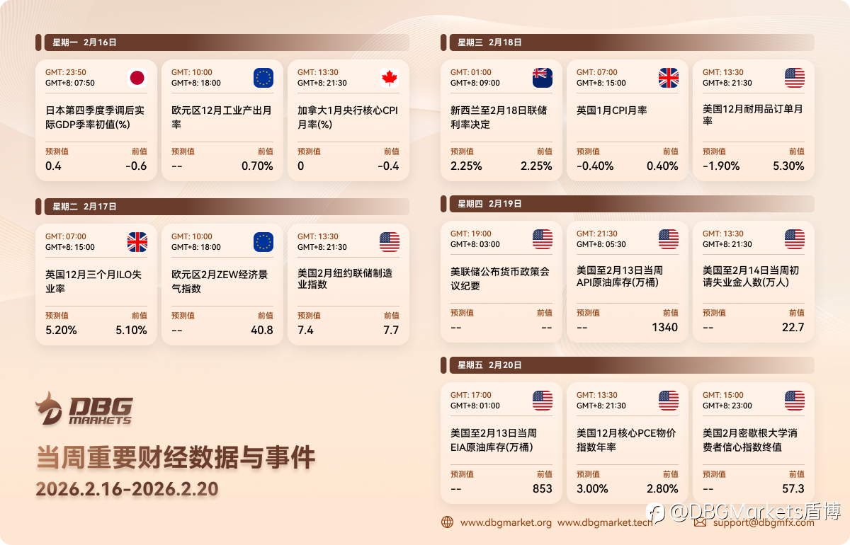 从通胀恐慌到 AI 疲劳:板块轮动的一周美元、贵金属与股市周度展望 回顾周五,备受瞩目的美国 CPI 数据略低于预期(2.4% vs. 2.7% 前值),有效缓解了近期的 “通胀恐慌” ,美国股市也随之企稳。美元 (US Dollar) 走势也趋于平稳,波动有限,市场正在继续消化本月早些时候的一系列重磅数据。 由于美国市场周一因休市,预计早盘流动性将较为稀薄。然而,本周日历依然排满了二线数据以及至关重要的 FOMC 会议纪要,这将决定 2026 年叙事的下一个阶段。 核心市场事件:非农后的现实核查 本周,市场焦点从原始就业人数转向通胀可持续性和增长韧性。市场的核心“压力测试”将出现在周中至周末