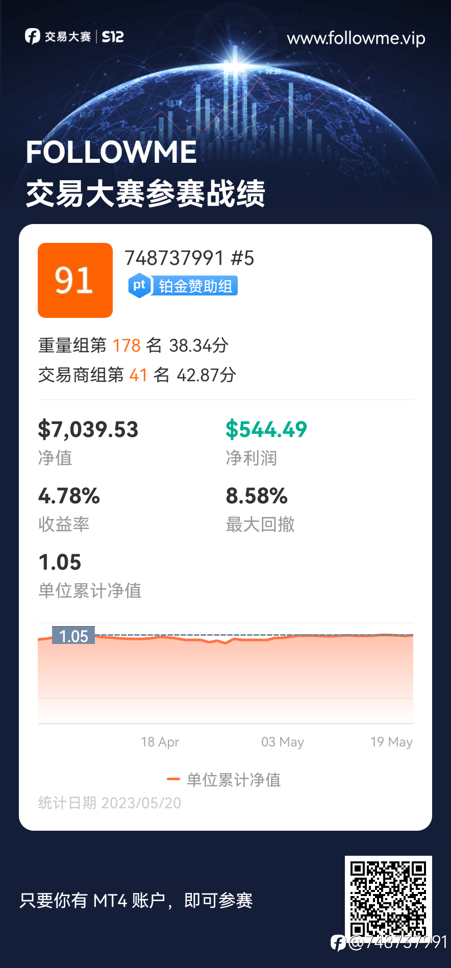 有许多网友对我的信号有兴趣,我也给了许多MT4只读帐户给他们线下去跟和观模,比较乱,所以为了便于统一管理吧和实力证实,社区的订阅费就设为0吧!原意的就去订!这样直接在社区订阅观看,更为直接,也不要费用,特殊的要线下MT4帐户和密码的私下可跟我要,都没关系的,订阅业务在后续可能专门人员去负责,目前也没太我精力去管,只是试试什么样流程,老友们多多指导提意见! 另外说明一下:因为此帐户是我线下打理的一个真实帐户,原也没有想做跟单的事情,后续要跟为照顾一些小资金帐户的,可以专开一个1000 --- 2000USD就可跟单帐户运行。目前社区开放的订阅最少需3000USD!