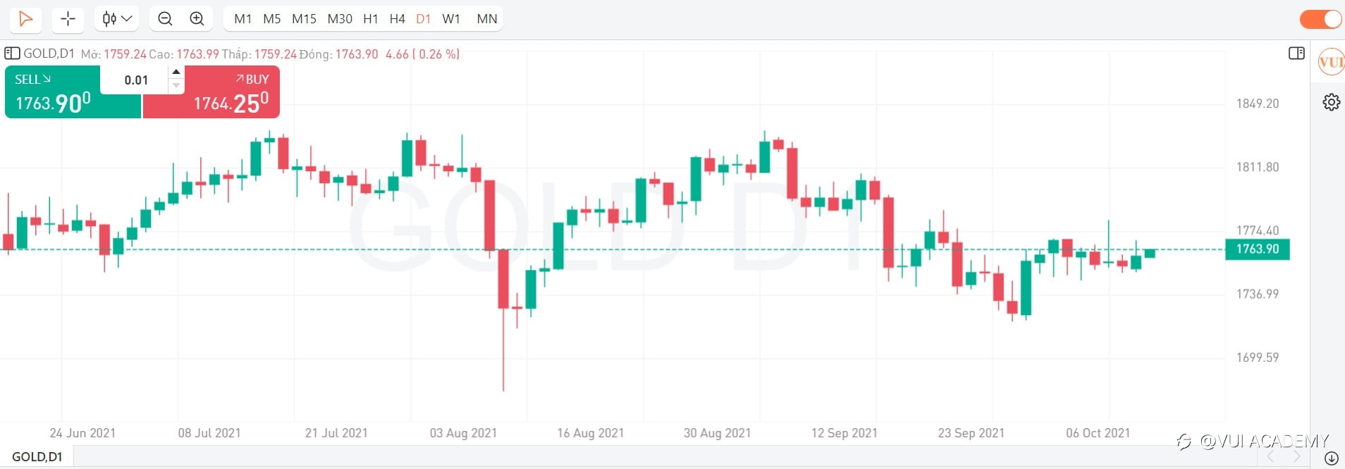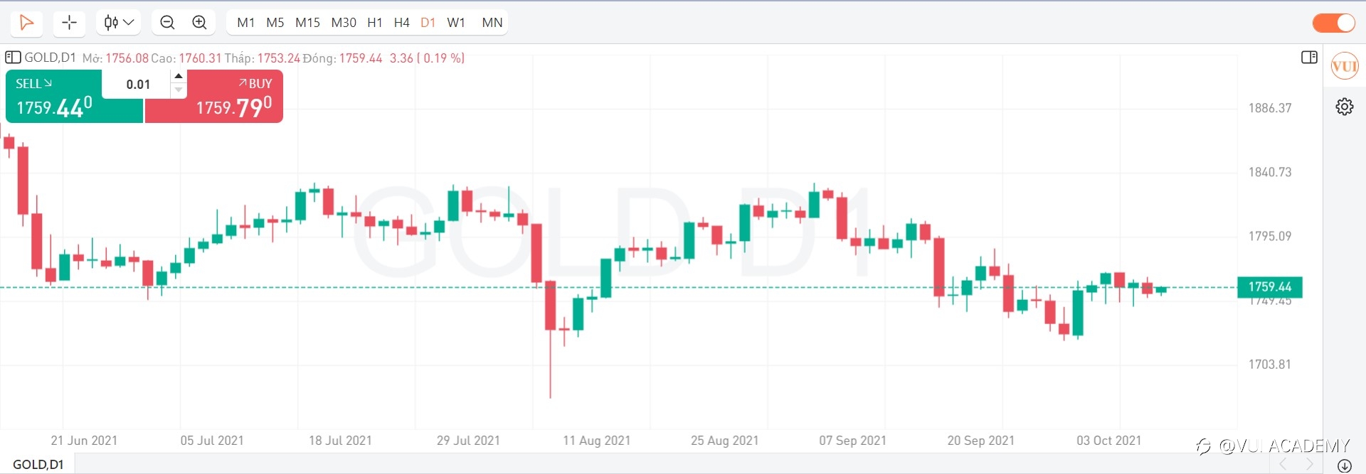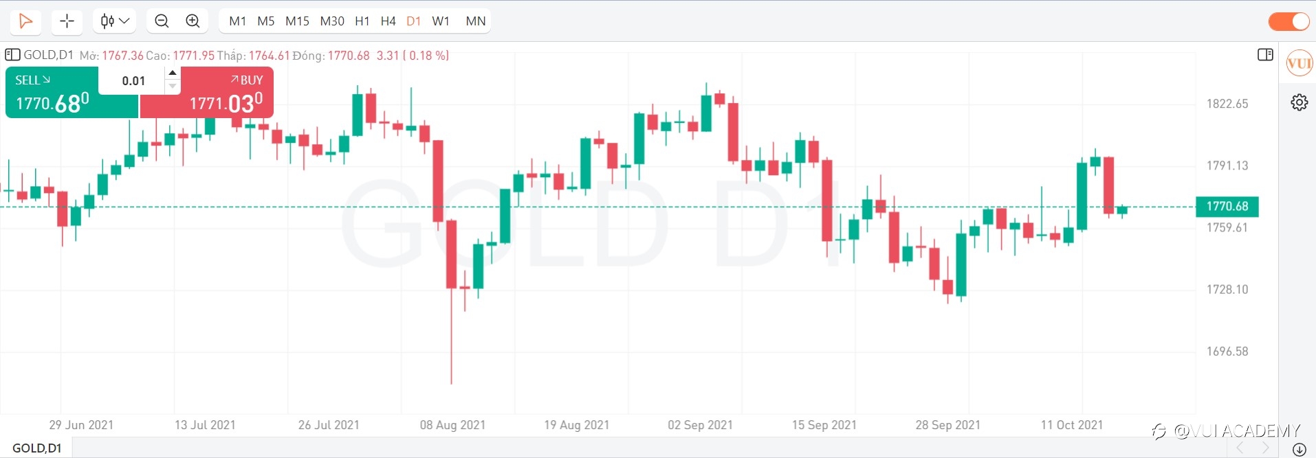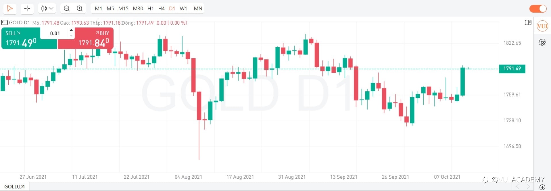 - KỊCH BẢN PHIÊN MỸ (27/08/2021): Vàng không vượt qua được vùng cản 1805 và tiếp tục đảo chiều về lại vùng cản 1779. Trong phiên Mỹ, dự báo vàng sẽ tiếp tăng trở lại, Nhà đầu tư có thể chờ về vùng 1779 hoặc đợi tín hiệu về hành động giá rồi BUY lên, TP: 6%, SL 3%. Thị trường cuối tuần, NĐT nên đóng các vị thế hoặc đảm bảo margin đủ để đảm bảo an toàn cho tài khoản. Trân trọng! #ChươngTrìnhThủLĩnhÝTưởng#