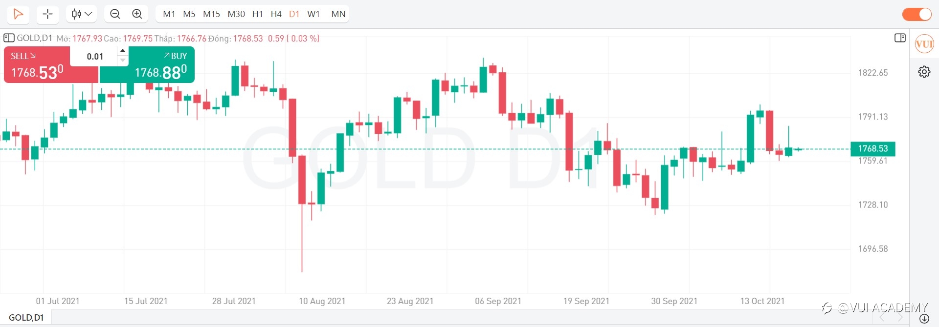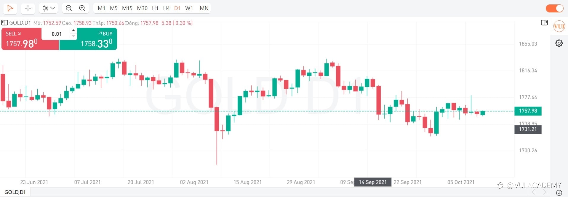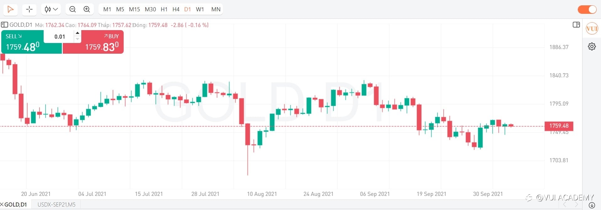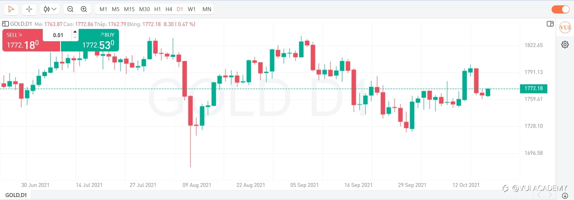 - KỊCH BẢN PHIÊN MỸ (27/08/2021): Vàng không vượt qua được vùng cản 1805 và tiếp tục đảo chiều về lại vùng cản 1779. Trong phiên Mỹ, dự báo vàng sẽ tiếp tăng trở lại, Nhà đầu tư có thể chờ về vùng 1779 hoặc đợi tín hiệu về hành động giá rồi BUY lên, TP: 6%, SL 3%. Thị trường cuối tuần, NĐT nên đóng các vị thế hoặc đảm bảo margin đủ để đảm bảo an toàn cho tài khoản. Trân trọng! #ChươngTrìnhThủLĩnhÝTưởng#