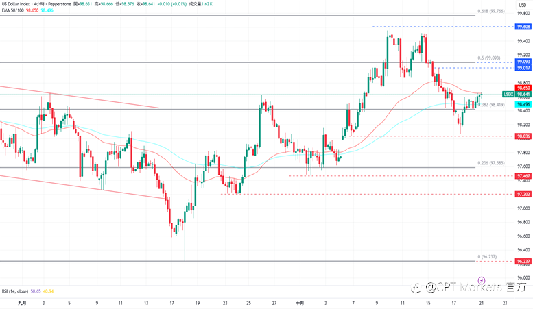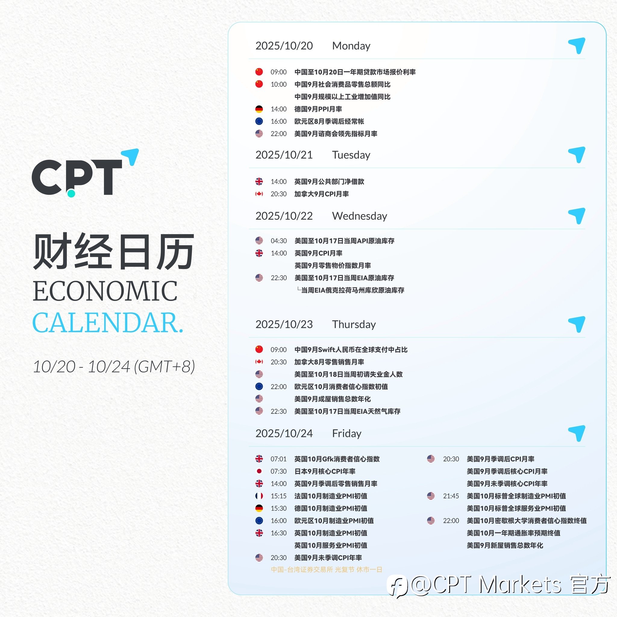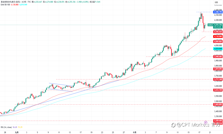 黄金/美元(XAUUSD): 新闻事件: 周五,黄金价格在上涨至4380.790美元的后史新高后回落至4250.93美元。黄金回落的主因是特朗普缓和对中国的威胁,以及美元走强。美国总统特朗普此前威胁11月1日起要对中国加征100%关税,不过,特朗普态度随后放软,表示加征中国100%关税「无法持续」,同时重申这些措施是对收紧稀土出口管制的回应,同时特朗普周五确认将与中国会晤,缓解市场对两国贸易冲突升级的不安情绪。展望后市,周一美国经济日程将公布9月咨商会领先指标月率。由于政府停摆持续,市场将聚焦于周五发布的9月消费者物价指数(CPI)数据。 技术面分析: CPT Markets分析师指出,黄金价