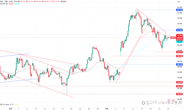 美元/日币(USDJPY): 新闻事件: 周一,美元/日元上涨至150.736日元。日本自民党与维新党将组成联合政府,带动高市早苗有望成为日本首位女首相。投资人预计高市若当选首相将推出大规模财政支出计划以刺激经济,并对日元造成压力。另一方面,日本央行审议委员高田创表示,日本经济已经承受来自美国关税的冲击,并且很可能已经实现百分之2的通膨目标,并重申目前是升息的适当时机,此前高田在9月曾投票反对维持利率不变。周二,日本央行副行长冰见野良三将发表演说,同时日本国会众、参两院将举行首相指名选举。 技术面分析: 美元/日元保持在151.398水平下方盘整,受EMA50的负面压力以及下跌趋势线尚未被突破