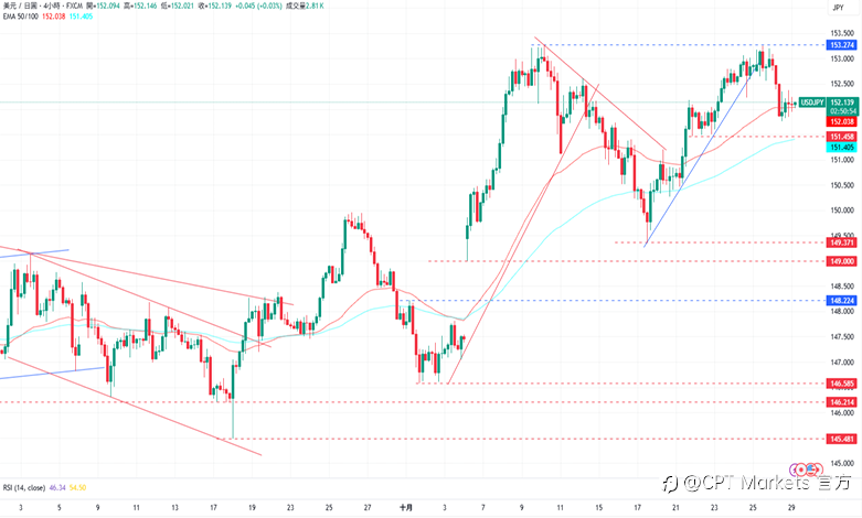 美元/日币(USDJPY): 新闻事件: 周二,美元兑日元下跌至152.09日元。美国总统特朗普于28日与日本首相高市早苗会晤,会后双方签署新协议,内容包括确保涵盖稀土在内的关键矿物供应链合作,以及美日将落实对等关税谈判等文件。此前,美国财政部长贝森特与日本财务大臣片山皋月会面时强调「稳健货币政策的重要性」,市场解读为呼吁日本央行升息,使美元兑日元走低。另一方面,日本新任经济再生大臣城内实表示,日本可以透过刺激需求、维持劳动市场紧缩来提升其长期潜在成长率,同时注意财政纪律的必要性。周三,美国美联储将公布利率决议;日本方面,当日将公布10月家庭消费者信心指数。 技术面分析: CPT Market
