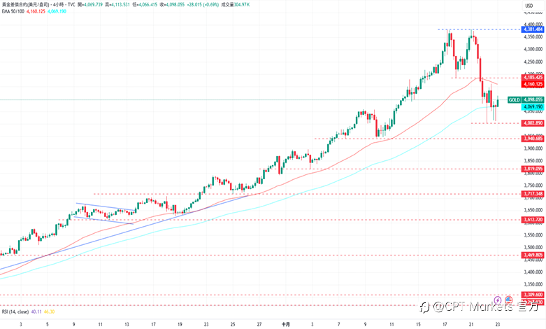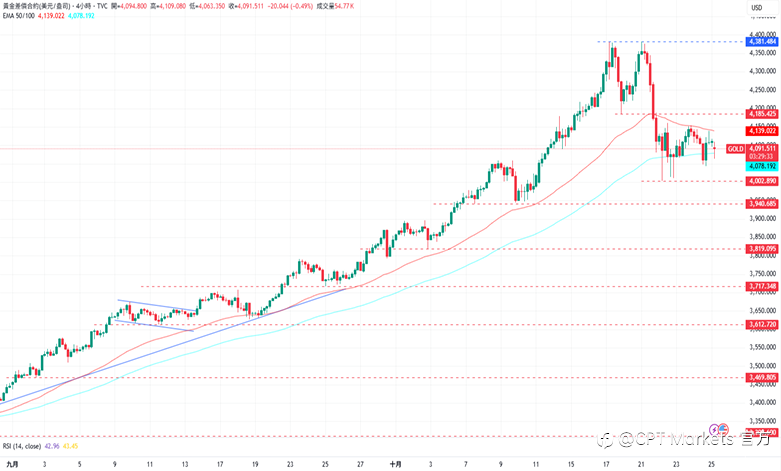 黄金/美元(XAUUSD): 新闻事件: 周三,黄金价格在下跌至4000美元附近后收复部分跌幅,收于4097.94美元/盎司。此前因投资者预期中美两国元首将讨论贸易协议,避免紧张局势升级,金价持续回调,但近期出现转折。根据路透社消息称,白宫正考虑限制对中国出口大量由软件驱动的产品,从笔记本电脑到喷射引擎,以反制中国的稀土限制。除此之外,美国财政部长贝森特宣布,美国计划在未来一天内宣布「大幅」增加对俄罗斯的制裁。展望后市,美国经济数据将公布9月成屋销售总数年化,周五美国劳工统计局(BLS)将公布美国9月消费者物价指数(CPI)。 技术面分析: CPT Markets分析师指出,黄金价格自在400