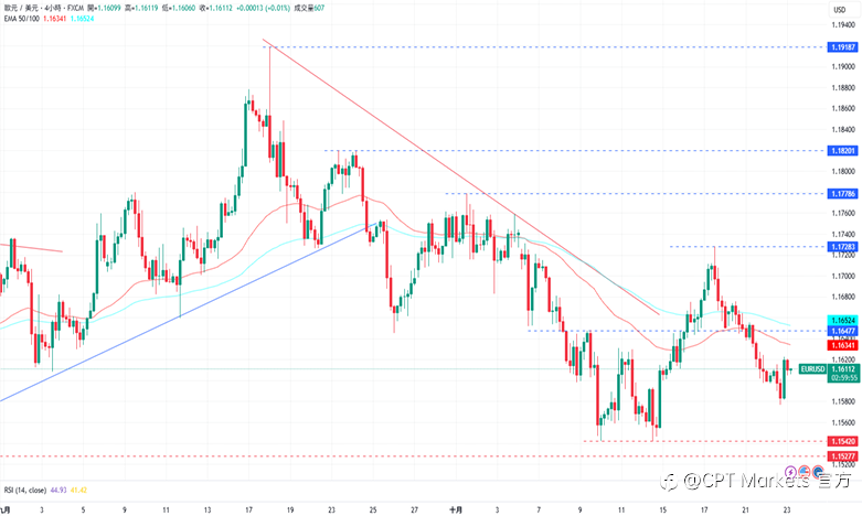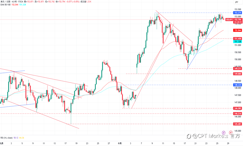美元/日币(USDJPY): 新闻事件: 周五,美元/日元上涨至152.868日元。美国方面,9月消费者物价指数(CPI)年增率为3%,略低于市场预期的3.1%;月增率为0.3%,亦低于预期的0.4%。疲软的通膨数据强化了市场对美联储(Fed)维持宽松政策的预期。日本方面,尽管国内通膨呈现回升迹象,日元仍持续走弱。日本政府周五公布数据显示,9月核心消费者物价指数(CPI)年增率为2.9%。展望后市,市场焦点将集中于本周的美联储利率决议。日本方面,投资人亦将关注周四日本央行的利率决议。 技术面分析: CPT Markets分析师指出,美元/日元维持在153.274水平下方盘整,以消化RSI指针的