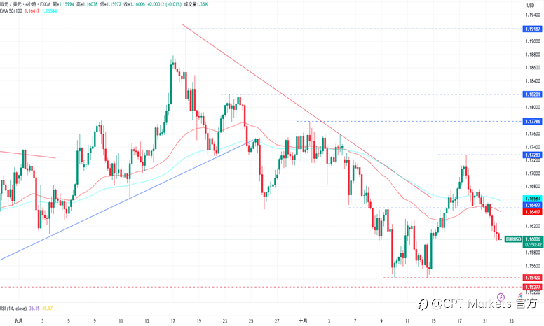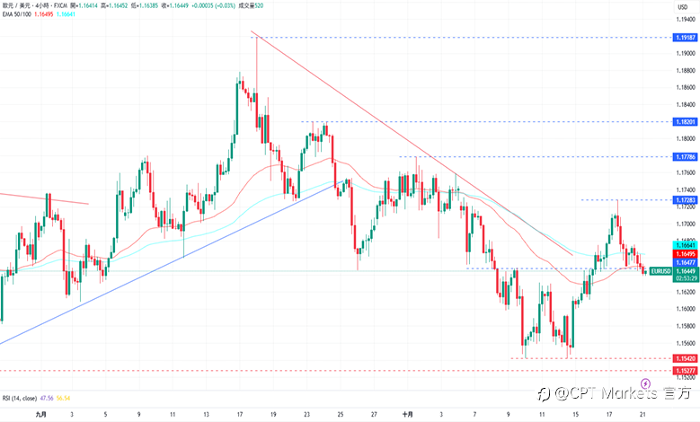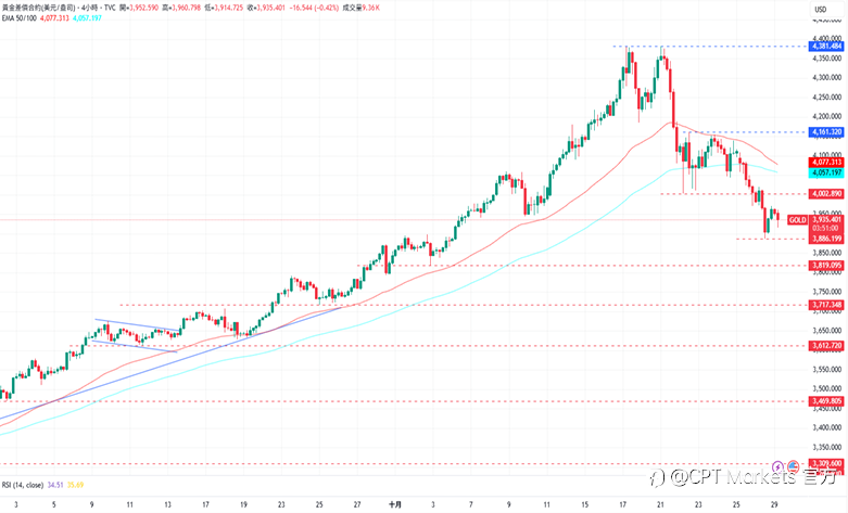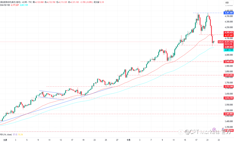 黄金/美元(XAUUSD): 新闻事件: 周二,黄金价格在测试4380美元附近的历史高点后大幅回落,收于4124.35美元/盎司。市场风险偏好回升导致避险需求下降,金价承压下滑。投资人对中美贸易紧张局势缓和,以及美国政府有望结束停摆的预期,使美元对主要货币全面走强。美国政府停摆已进入第四周,目前仍未出现明确的结束迹象。不过,白宫首席经济顾问哈塞特曾表示,政府关门「很可能在本周结束」。展望后市,本周美国经济数据发布有限,市场焦点将集中于周五公布的消费者物价指数(CPI)报告,以寻找美联储后续政策方向的线索。 技术面分析: CPT Markets分析师指出,黄金价格自4380美元水平再度回落,并在