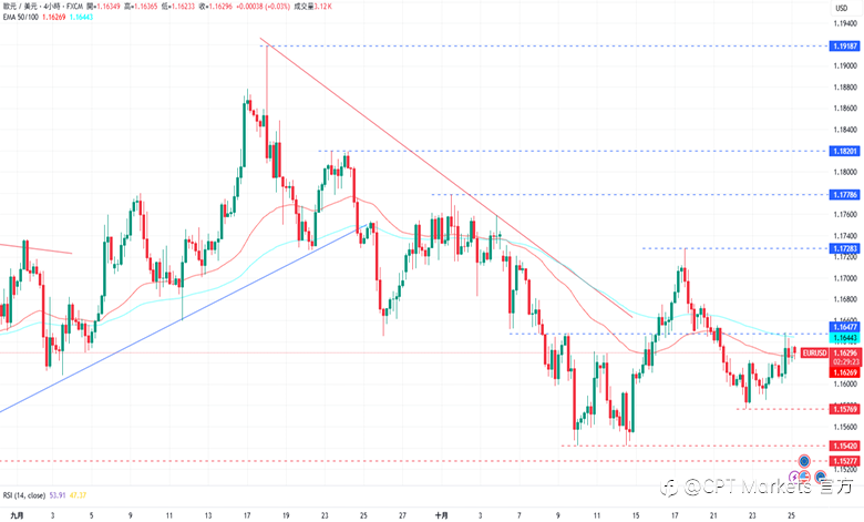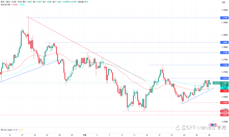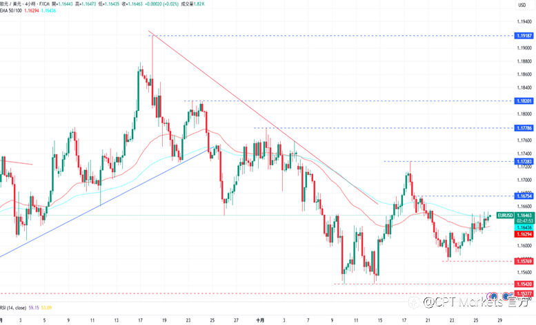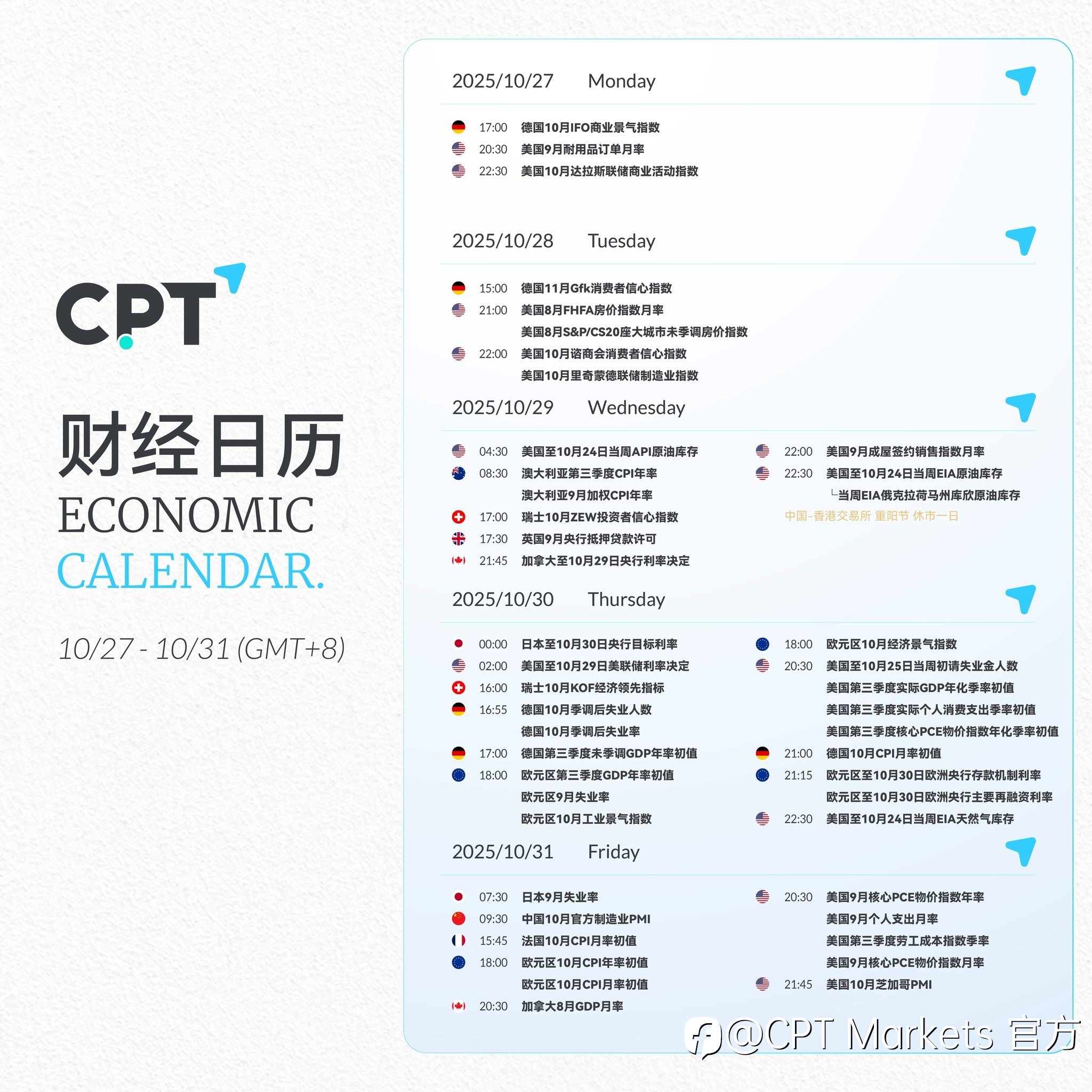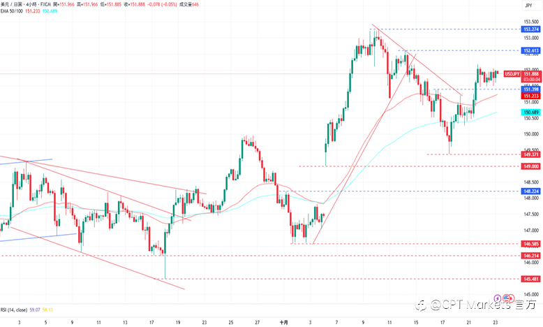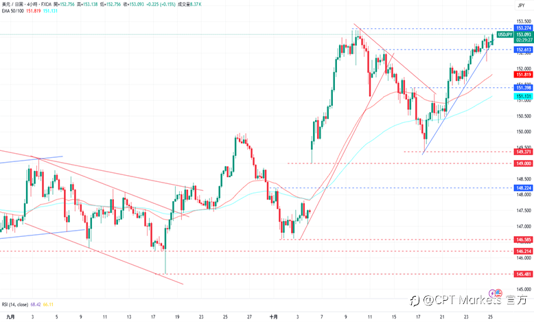 美元/日币(USDJPY): 新闻事件: 周一,美元兑日元上涨至152.871日元。因市场预期日本新任首相高市早苗将推行扩张性财政政策,并抵制货币收紧政策,推动美元兑日元延续涨势。本周市场焦点为稍晚举行的多国央行会议。市场普遍预期,美国美联储将于周三宣布降息,而日本央行则将维持基准利率在0.50%不变。周一公布的数据显示,日本9月企业服务物价指数年率连续第二个月上升,从8月的2.7%升至3.0%。展望后市,市场将关注周二美国总统特朗普与日本首相高市早苗的会晤。此外,美国将公布10月咨商会消费者信心指数与10月里奇蒙德联储制造业指数。 技术面分析: CPT Markets分析师指出,美元/日元受