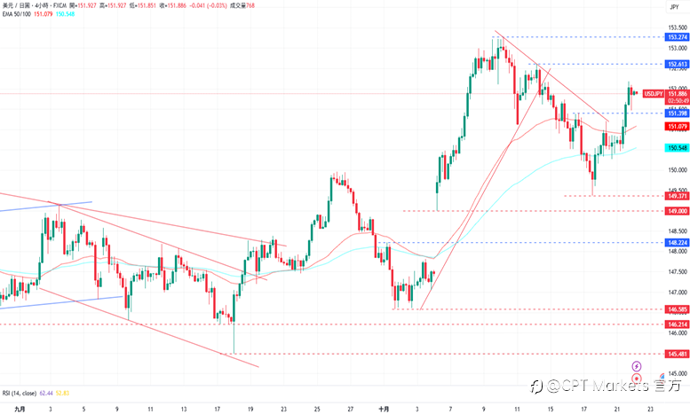 美元/日币(USDJPY): 新闻事件: 周二,美元/日元上涨至151.927日元。在高市早苗当选日本下一任首相后,日元大幅走弱。市场预期她将推出的财政刺激政策有望提振经济情绪,但同时意味着货币政策收紧周期可能延后,使日元面临进一步贬值压力。日本媒体报导指出,高市周二已任命众议员片山皋月出任财务大臣,此举加剧市场对新政府政策走向的不确定性,片山在今年3月接受《路透社》采访时曾暗示她倾向支持日元走强。美元方面,美国总统特朗普周一表示,预期将与中国达成贸易协议,此前白宫首席经济顾问哈塞特也表示,政府关门「很可能在本周结束」。周三,日本将公布日本9月商品进、出口年率。 技术面分析: 美元/日元突破了